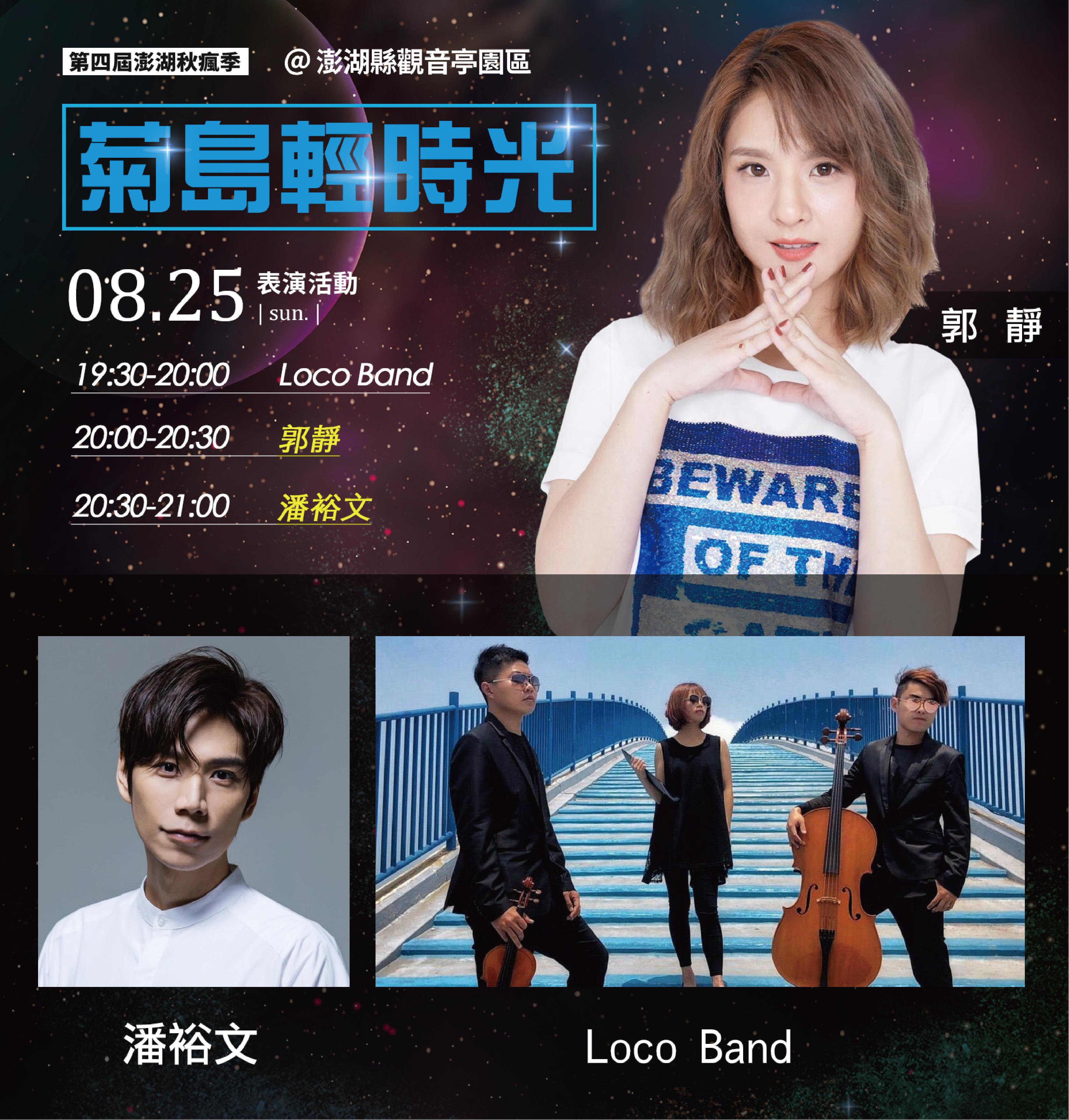 交通部觀光署澎湖國家風景區管理處於8月17日澎湖觀音亭園區絢麗開幕後,既定每周六接續大咖歌手開唱,8月25日主題「菊島輕時光」邀請到純愛教主郭靜以及潘裕文演唱膾炙人口主題曲,用最輕柔的聲音搭配澎湖的海風徐徐,帶著大家享受最輕鬆、最優美的澎湖時光,不只如此,現場還邀約澎湖在地表演團體Loco Band要用在地的熱情,嗨翻全場。