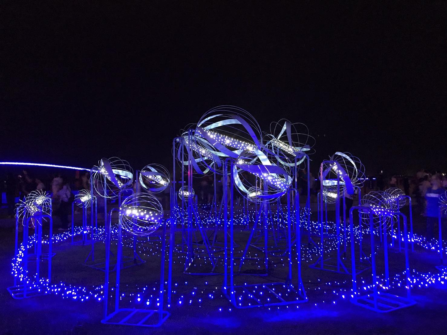 「2019澎湖國際海灣燈光節」精心設計15米長主燈鯨動海灣及光耀菊島的大型燈飾展演之外,周邊燈飾藝術品也是每組都深具看頭,尤其以「秋。風動」用澎湖最原始的風力轉速搭配光影的效果,呈現出截然不同的燈光設計作品「季節在變,島嶼不歇」,在澎湖「秋瘋(風)季」的自然條件下,結合環境互動藝術及機械性能,利用風動裝置的概念打造「秋。風動」這項燈光藝術,靜的澎湖還有隨風起舞的澎湖,這組燈飾給人截然不同的視覺感受,讓你享受風,看見風。