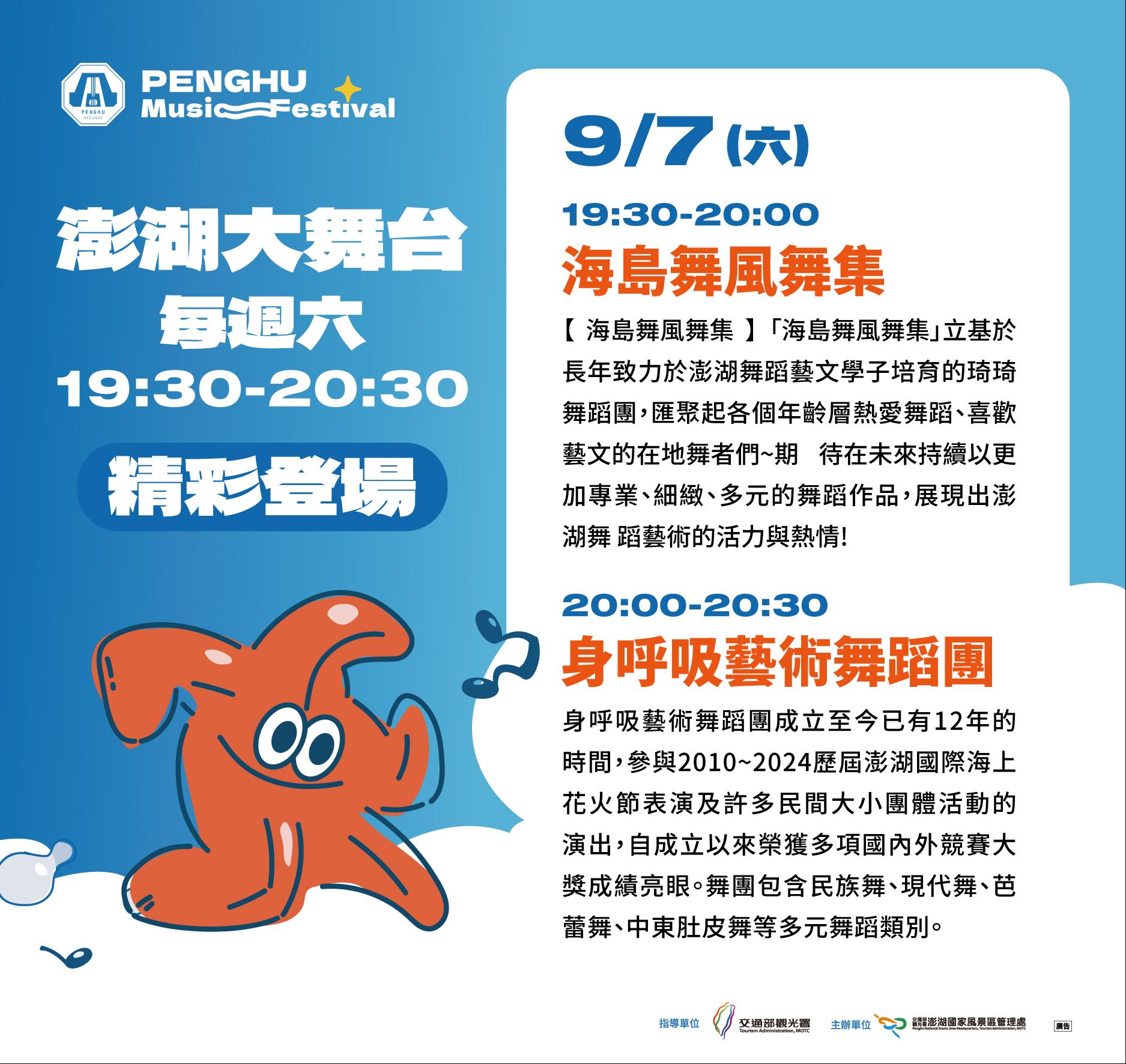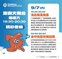 9/7(六)「澎湖大舞台」邀請到海島舞風舞集及身呼吸藝術舞蹈團於晚間7點半至8點半演出,海島舞風舞集匯聚各年齡層熱愛舞蹈、喜歡藝文的在地舞者們,以專業、細緻、多元的舞蹈作品,展現出澎湖舞蹈藝術的活力與熱情;身呼吸藝術舞蹈團自成立以來榮獲多項國內外競賽大獎成績亮眼,舞團包含民族舞、現代舞、芭蕾舞、中東肚皮舞等多元舞蹈類別。