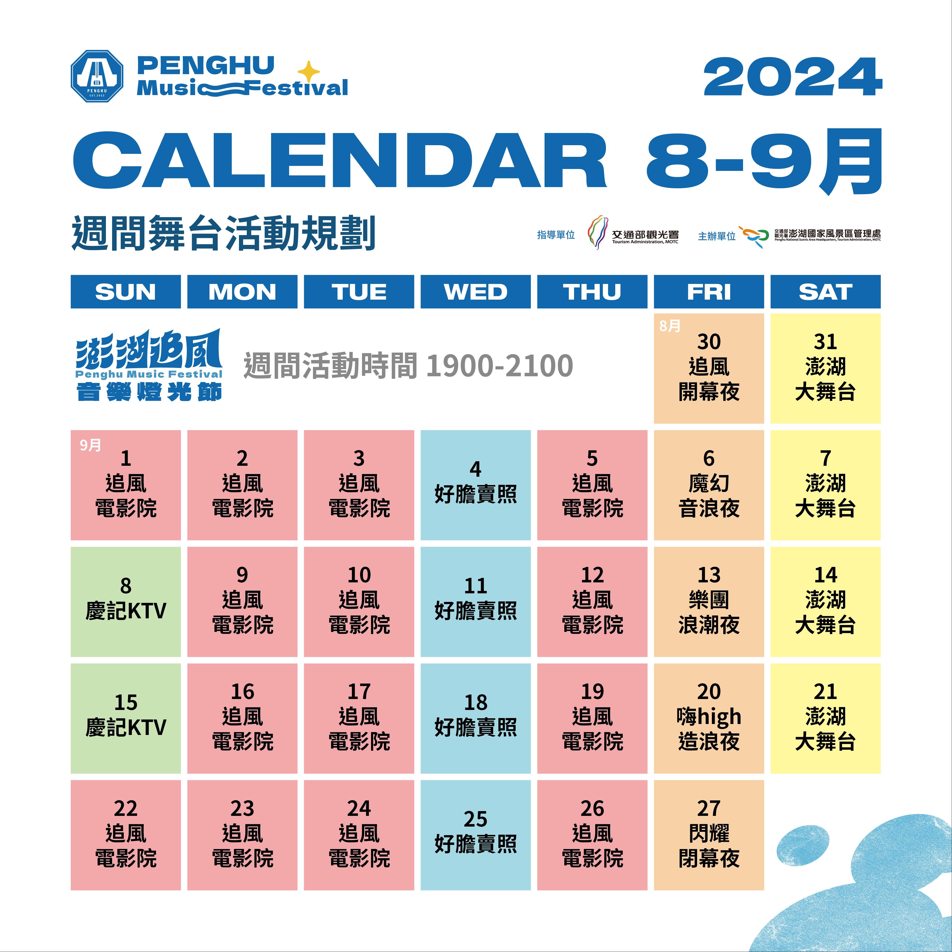 另外113年8月30日至9月27日期間除週五音樂展演活動之外,更於每日規劃週間活動包含「追風電影院」、「好膽賣照」、「澎湖大舞台」及「慶記KTV」,讓2024澎湖追風音樂燈光節熱力不斷電。澎湖追風電影院晚間7時整,在星空與海風的環繞體驗下,14部經典好片帶您體驗最Chill的露天電影院:9/3(二)播出來自法國的溫馨喜劇《親愛的小鬼們》邀來凱薩獎影后莎拉佛斯提耶溫馨出演。劇中細膩刻劃當前許多家庭面臨的育兒困境,並道出不論老少都該保有赤子之心的動人之處;9/5(四)即將播出《之前的我們》,本片獲選為柏林影展正式競賽片,榮獲外媒一致評為今年度最佳的情感片。在週五的音樂節狂歡後,將以海天打造出專屬澎湖的追風電影院,請大家不要錯過。