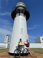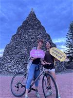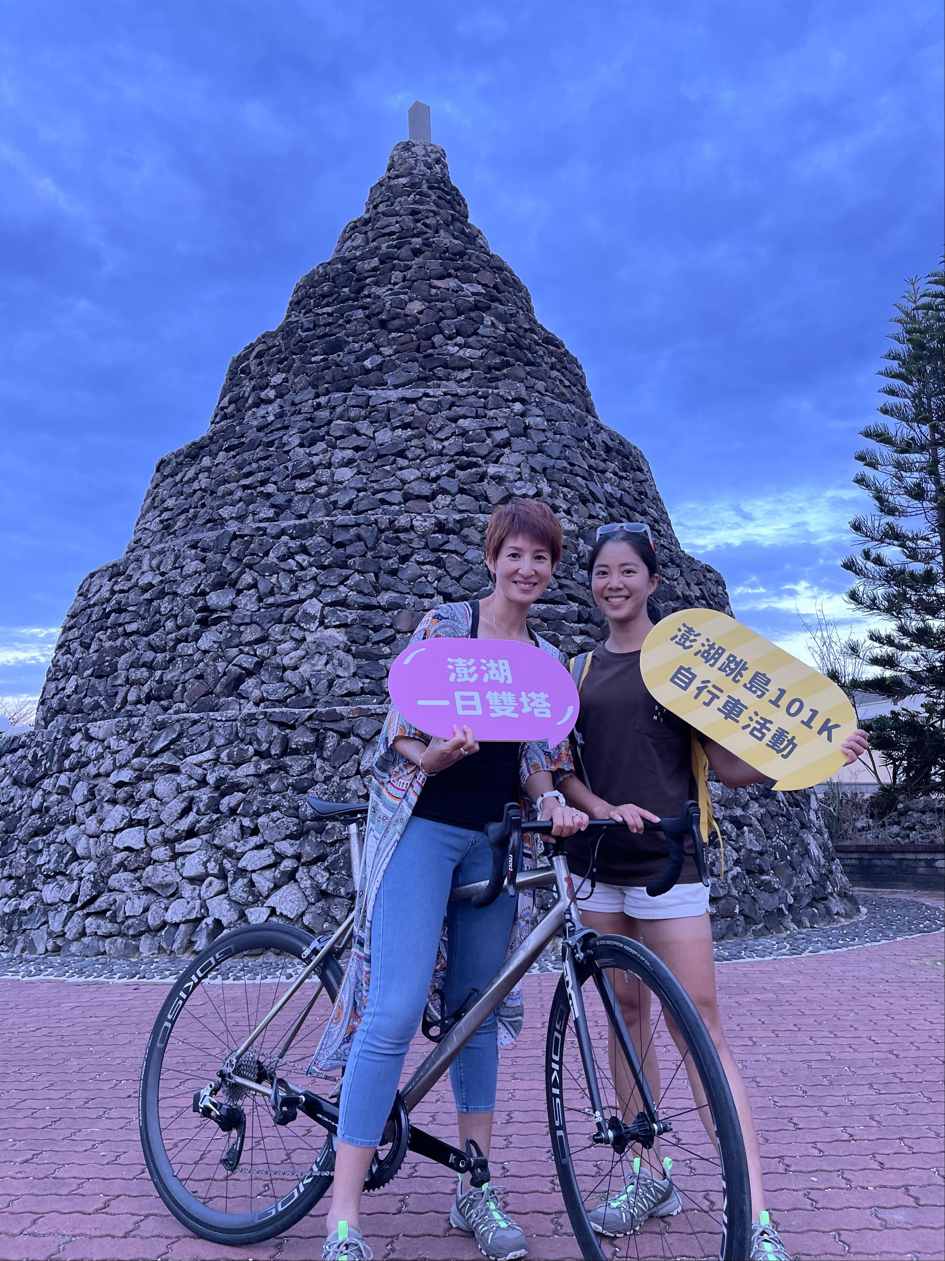 (圖說四)鐵人美女主播夏嘉璐(左)、侯以理(右)解鎖澎湖跳島101K一日雙塔於鎖港北塔前合影