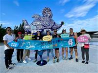 ( 圖說六)澎湖自行車跳島嘉年華辦理踩線團,由鐵人美女雙主播夏嘉璐(右五)、侯以理(右三)及土耳其裔自行車女神舒(左四)舒領軍於澎湖新地標嗨鼠前合影