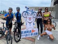 (圖說一)澎湖自行車跳島嘉年華邀請鐵人美女雙主播夏嘉璐(左二)侯以理(左一)及土耳其裔自行車女神舒舒(右三)領軍比基尼辣妹試點踩踏共同為台灣自行車日活動造勢