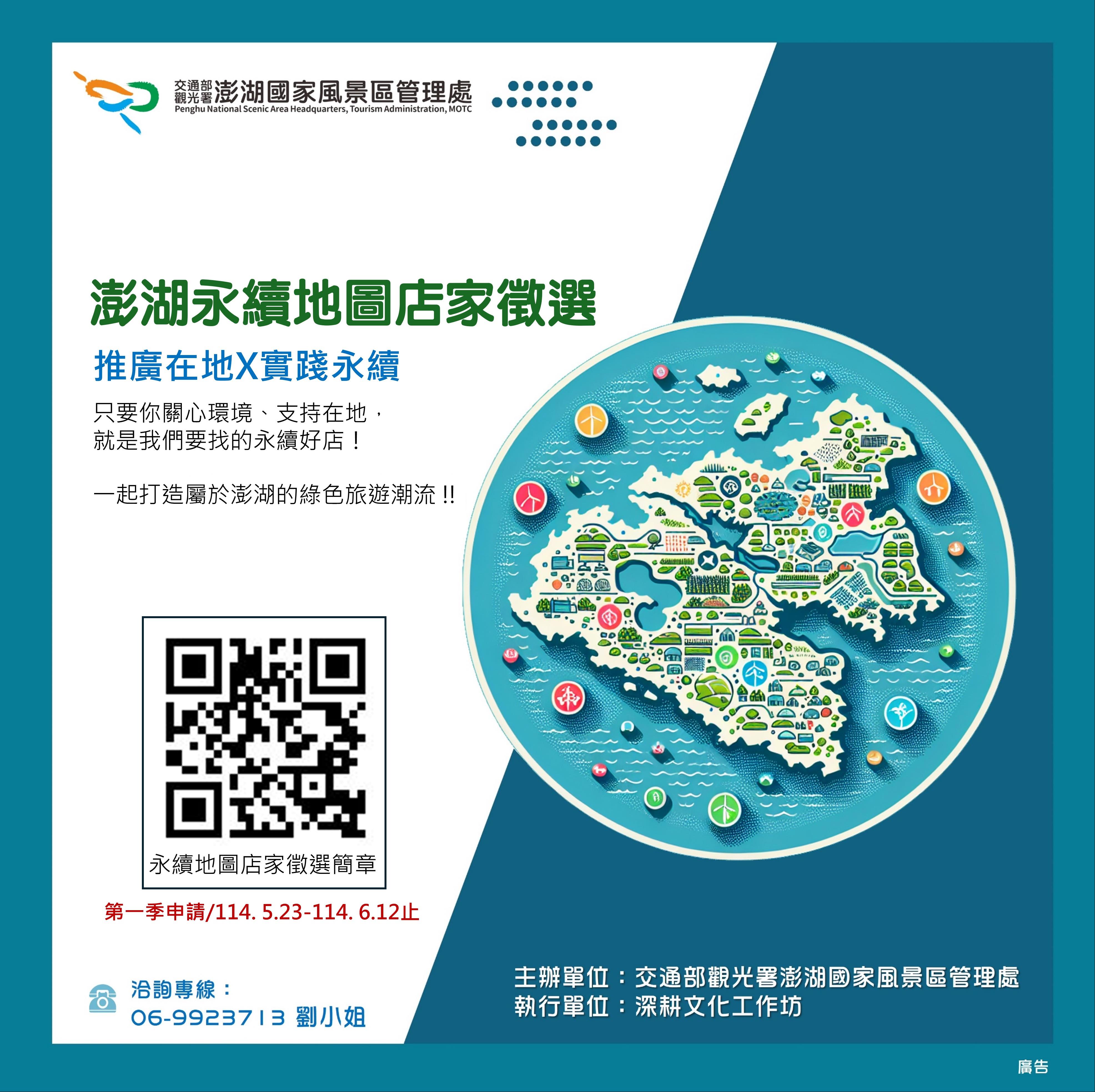 交通部觀光署澎湖國家風景區管理處為貼近澎湖在地旅遊業者逐步遵循永續理念的實際需求,將推動澎湖永續地圖店家徵選計畫。冀期透過本計畫將具有永續意識與實際行動的業者匯集形成永續地圖,讓更多遊客認識在地的永續店家,共同打造友善環境、促進島嶼永續發展的旅遊文化,併誠摯邀請有意願共同攜手推動澎湖永續旅遊的業者加入。