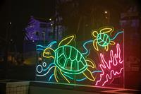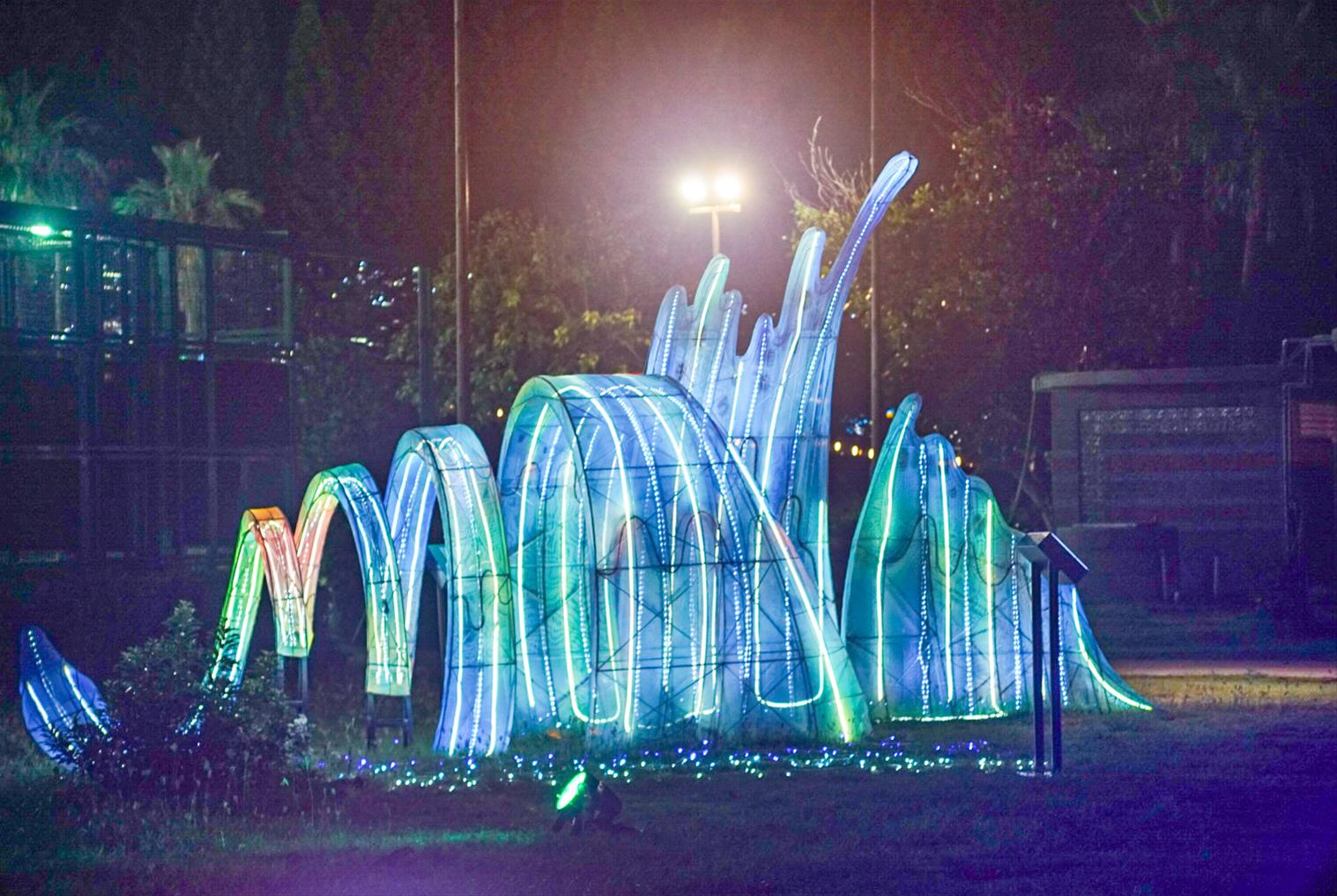 《菊島敘事》透過霓虹光線描繪澎湖的自然地景與生態文化,包括玄武岩奇觀與綠蠵龜棲息地。