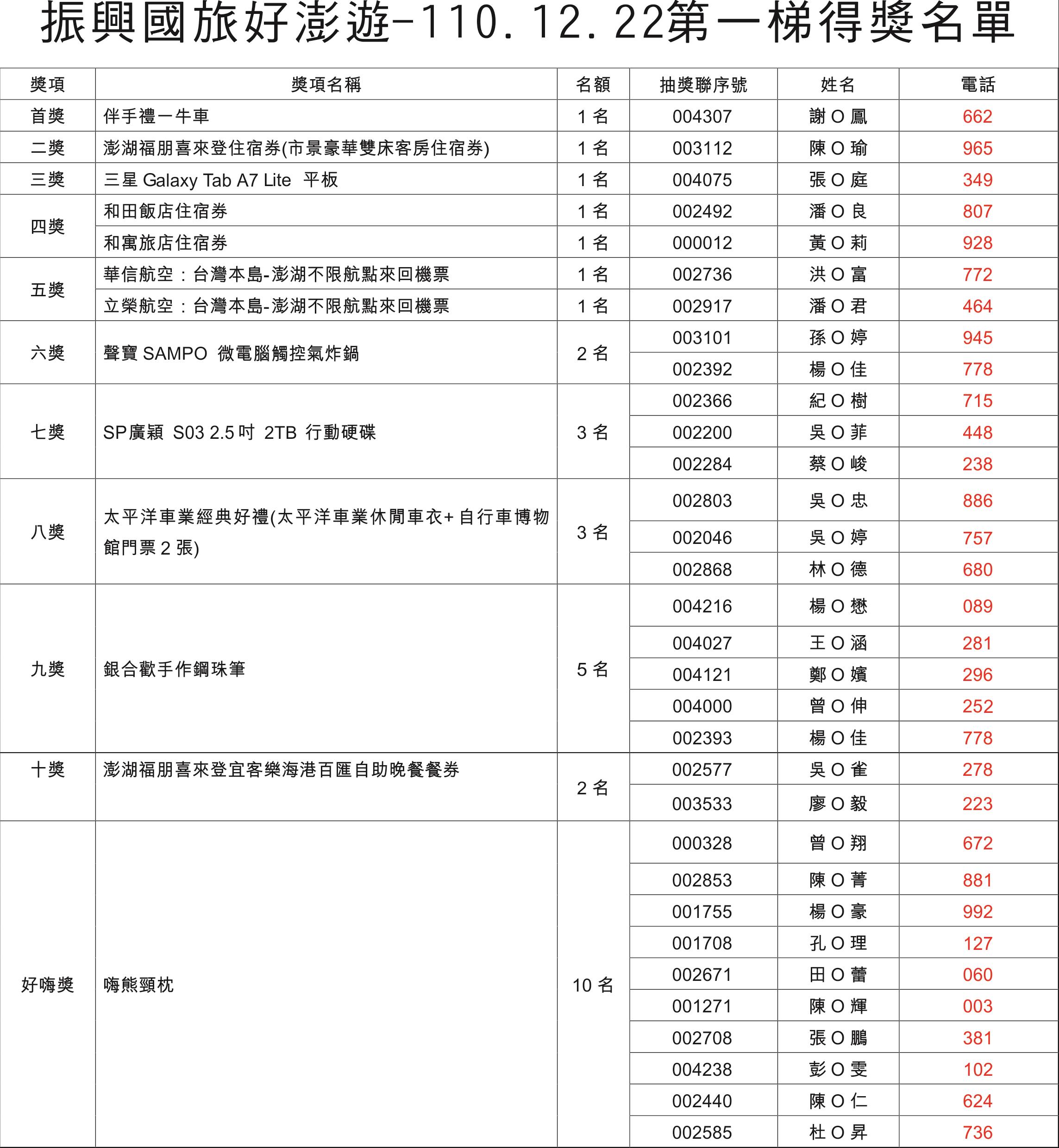 振興國旅好澎遊活動自110年11月1日起開始進行,已有超過170家澎湖產業共襄盛舉。截至昨日,已有投遞超過4,300餘張抽獎券,吸引超過4千名民眾參與活動,今(22)日上午10時,於澎管處進行第一梯次網路直播抽獎,抽出首獎澎湖名產一牛車及澎湖福朋喜來登酒店、和田飯店等知名旅宿住宿券、華信航空及立榮航空之台灣-澎湖不限航點來回機票等澎湃好禮,共計逾30份獎品皆由自台灣來澎湖旅遊的遊客抱走好禮。