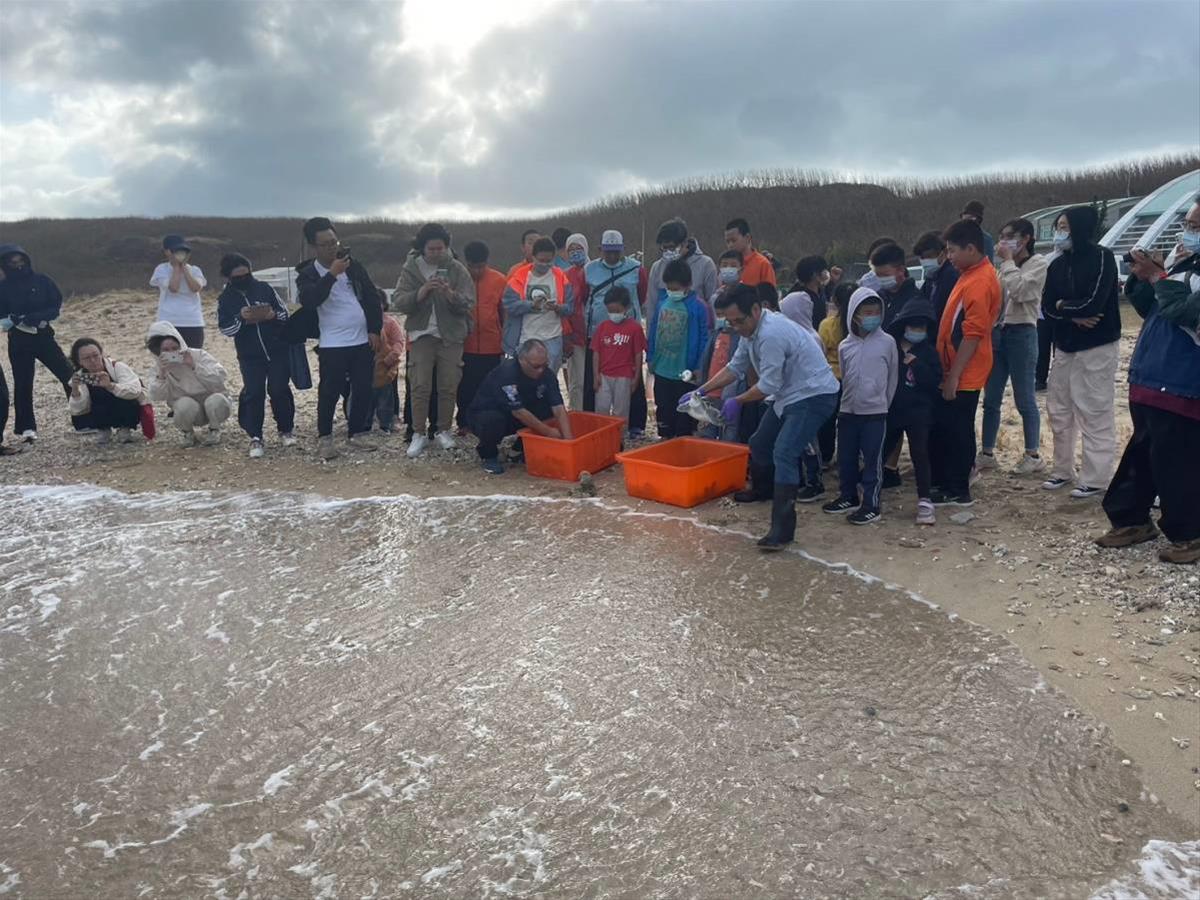 交通部觀光署澎湖國家風景區管理處(以下簡稱澎管處)於11月7日下午假望安綠蠵龜觀光保育中心前海域進行海龜野放,與在地望安國中、國小、幼兒班師生及望安日照中心、到訪遊客等,一同為2隻綠蠵龜回歸大海展開新旅程遞上祝福。