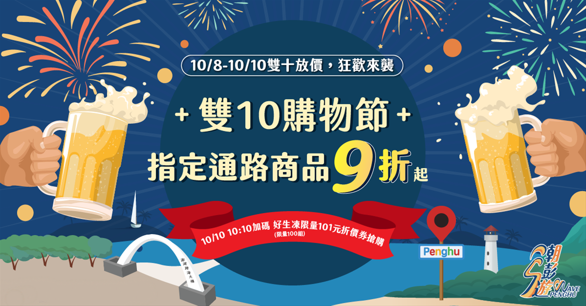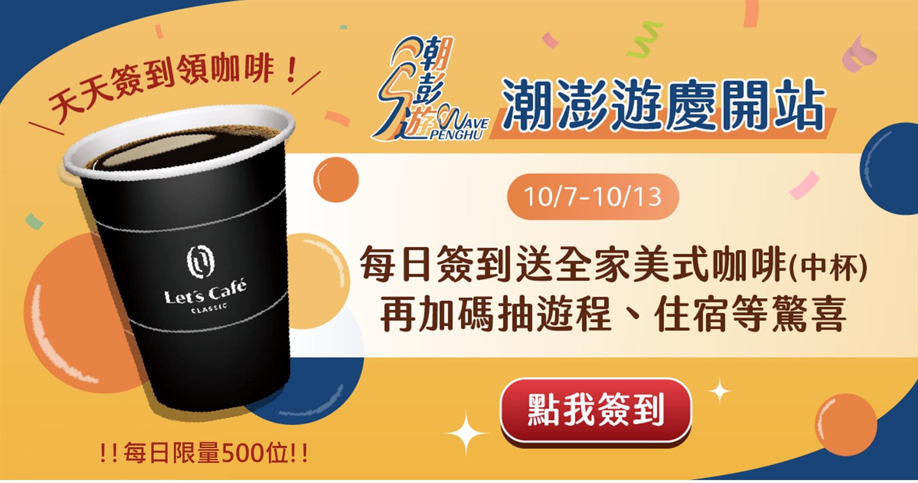 為慶祝平台開站,澎管處推出「每日簽到送咖啡,再加碼抽澎湖遊程/住宿」活動。於活動期間(10/7-10/13),民眾每日可於活動頁面簽到,簽到後即可獲得「全家美式咖啡(中杯)」兌換券【每日限量500名】,可再加碼抽澎湖遊程及住宿券。除此之外,在下週國慶期間也將同步推出「雙十放價,狂歡來襲」活動。活動期間內(10/8-10/10),本平台指定通路(KKDAY、好生凍)商品9折,並於10/10當日早上10:10在好生凍通路搶購【限量100張101元折價券】活動。