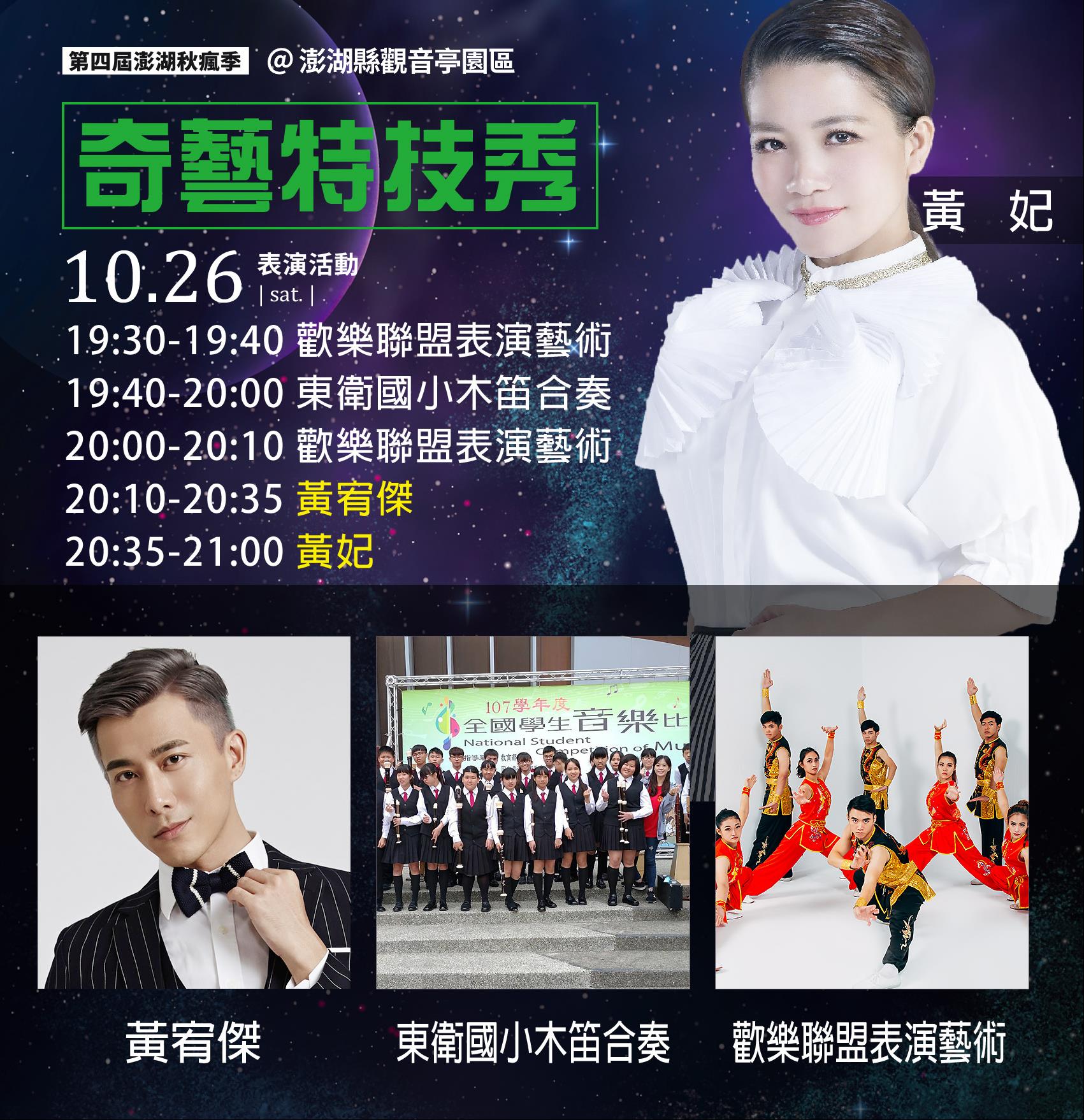 澎湖國際燈光節自8月份開跑至今進入倒數兩周,本週六舞台之夜由實力歌后黃妃領軍帶來讓遊客一飽耳福的曲目,演歌舞三棲的躁咖男神黃宥傑以乾淨嘹亮的聲音傳唱菊島夜晚,在地木笛比賽常勝軍東衛國小將帶來優美的木笛合奏表演,以及屢屢代表台灣出國交流的表演藝術團隊「歡樂聯盟」,將以深厚的表演功夫替澎湖夜晚獻上歡樂元素!10月26日千萬別錯過本場舞台表演!