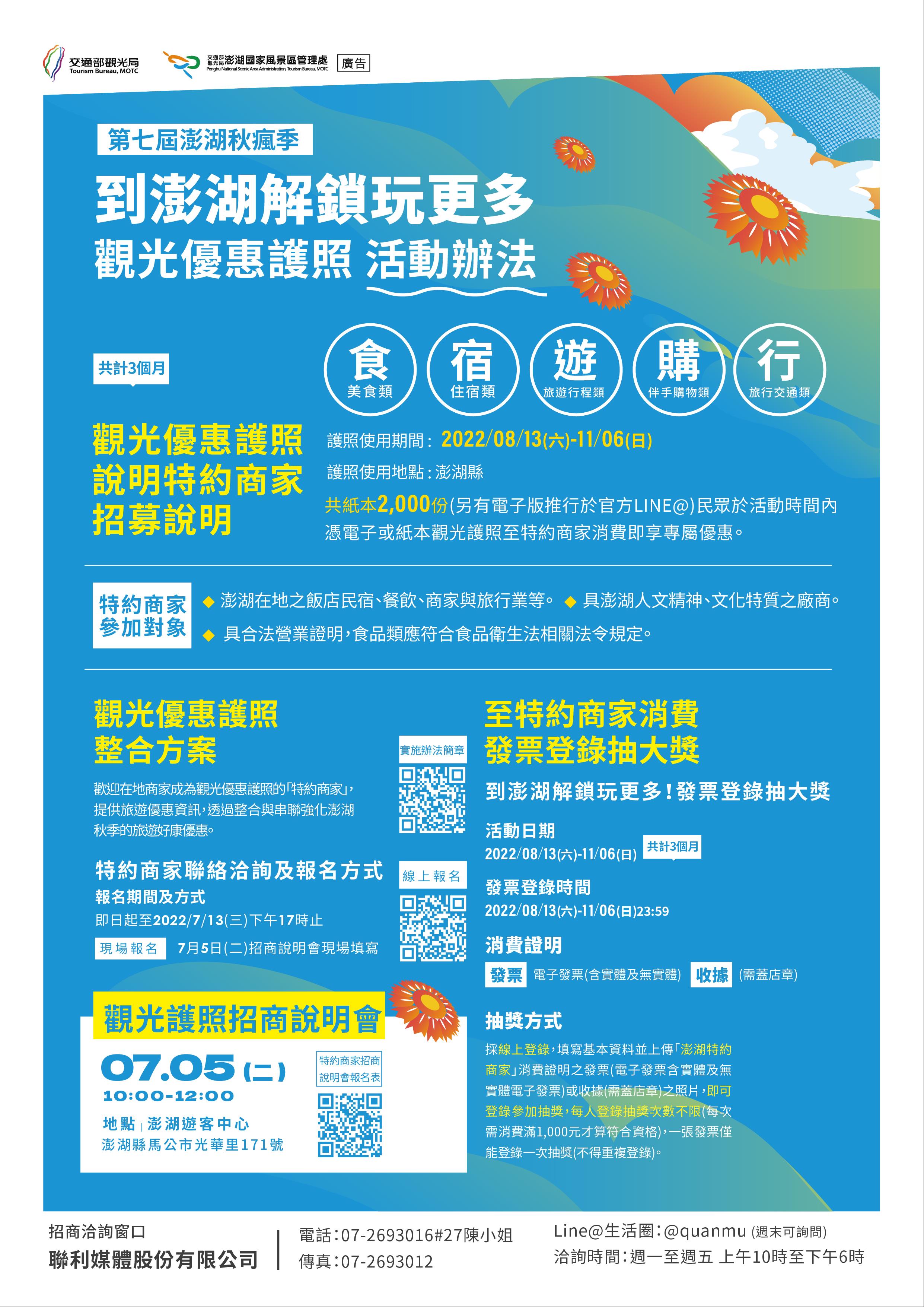 『第七屆澎湖秋瘋季』觀光優惠護照,目前正擴大邀募合作廠商,並訂於7月5日(星期二)上午10時整,假澎湖遊客中心辦理說明會,誠摯邀請澎湖地區各旅宿、餐飲、特產店、旅行社等業者或公、私部門展館等共同參與,並請廣為宣導周知。