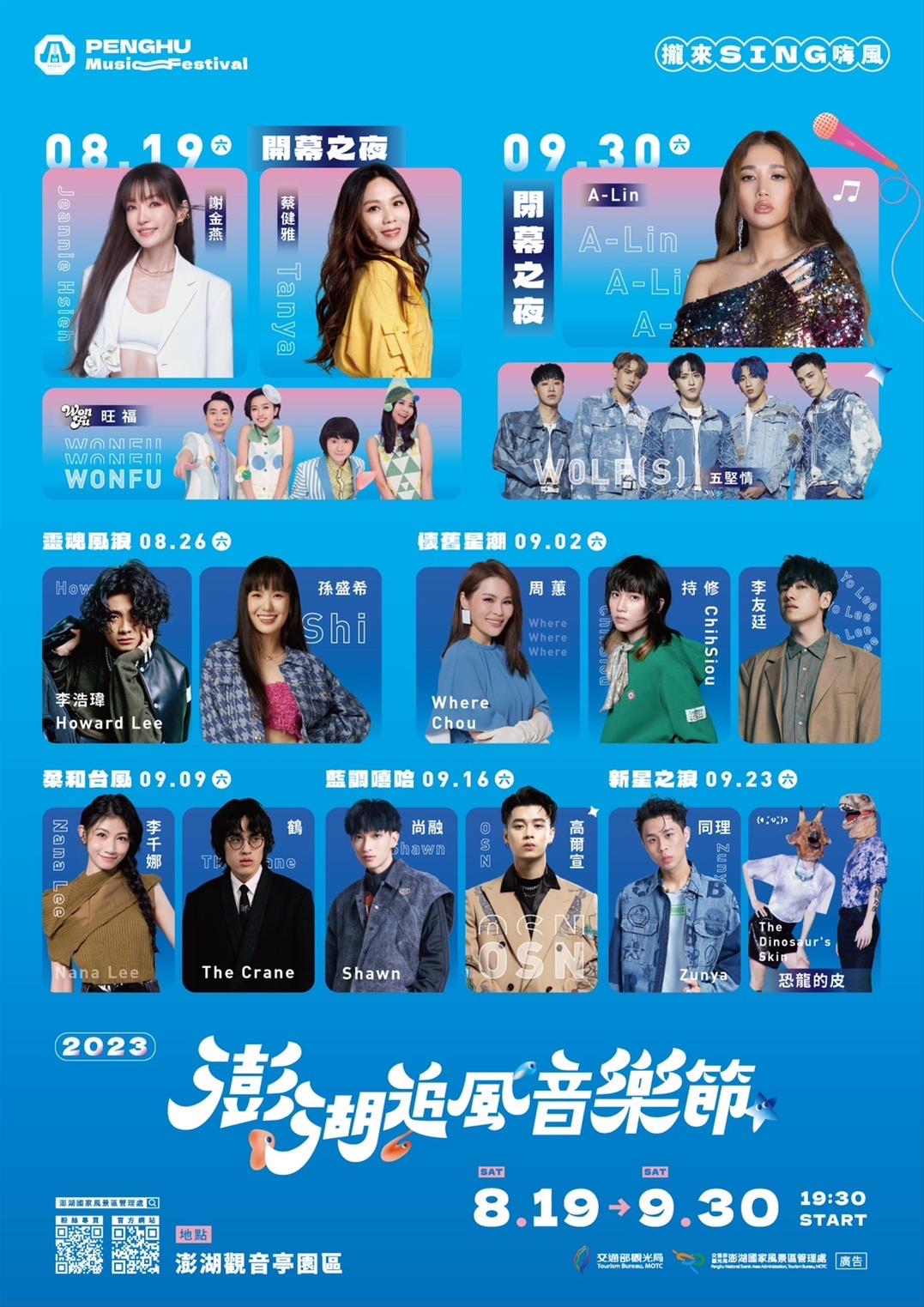 交通部觀光署澎湖國家風景區管理處將於8月19日(六)至9月30日(六) 於澎湖觀音亭舉辦2023澎湖追風音樂節,去年2022澎湖追風音樂節吸引超過10萬名遊客齊聚澎湖,今年將延續熱潮,盛大登場,超強卡司包含蔡健雅、謝金燕、A-Lin、五堅情等陣容,號召所有熱血樂迷們,一起遊澎湖、吃美食,享受最療癒的音樂饗宴。