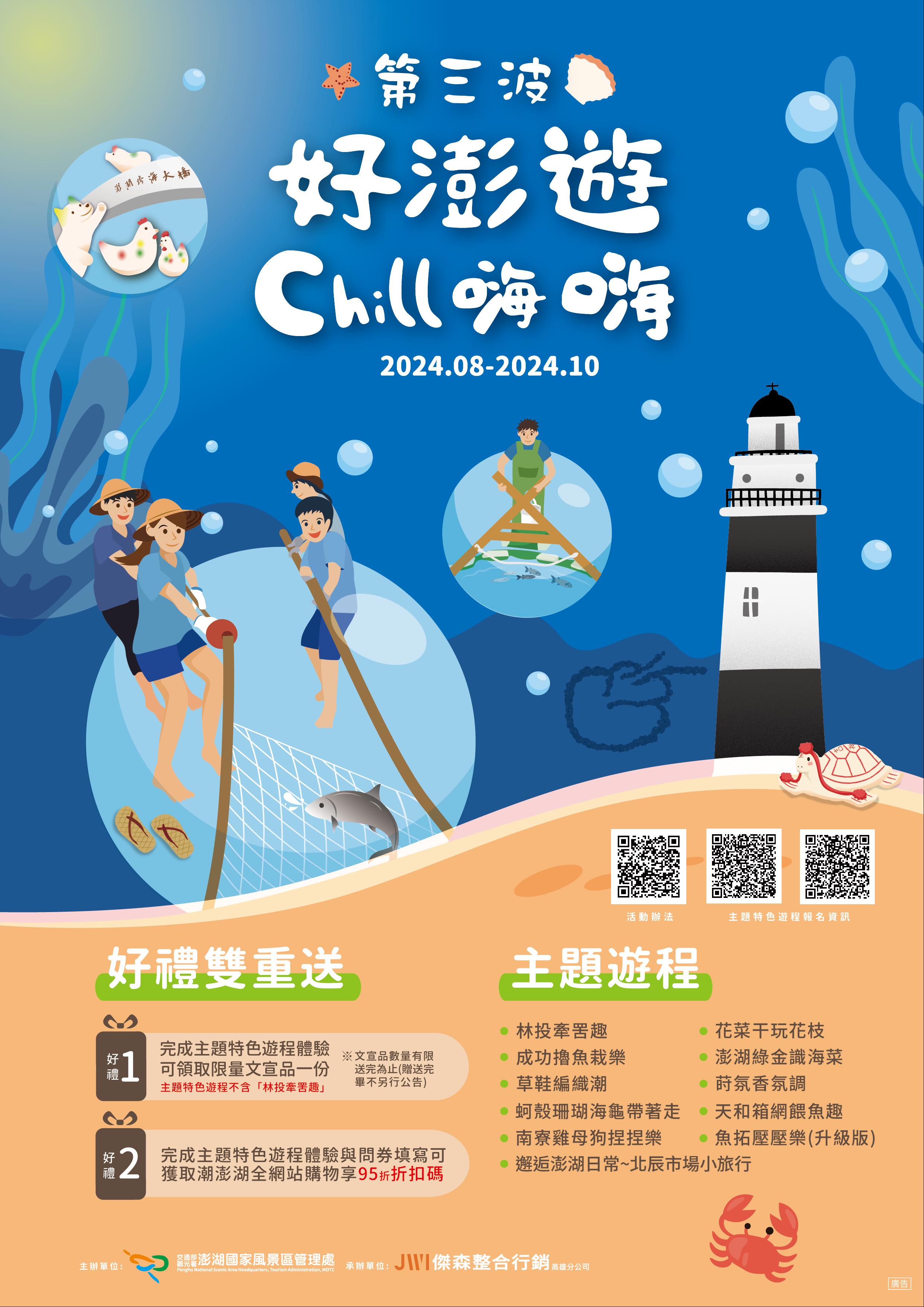為回饋第一波與第二波「好澎遊Chill 嗨嗨」澎湖主題特色遊程受到大眾的喜愛,澎管處於今(113)年8~10 月第三波活動繼續加碼、民眾只要參加任一主題特色遊程,即可享有好禮雙重送:第一重:參加主題特色遊程並完成指定任務可至指定地點領取文宣品一份(數量有限、送完為止)。