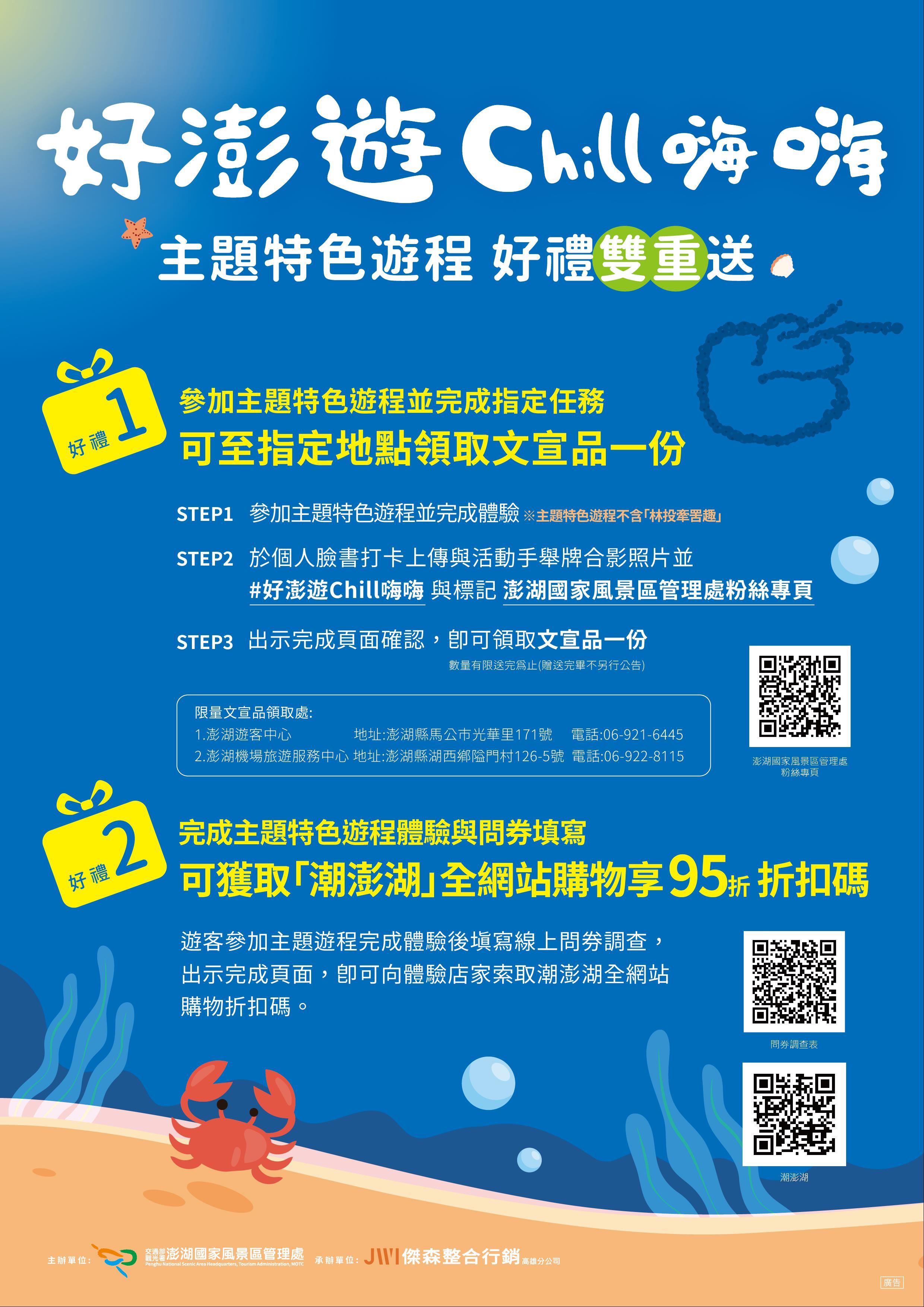 文宣品領取處:澎湖遊客中心、澎湖機場旅遊服務中心第二重:完成主題特色遊程體驗與問券填寫可獲取「潮澎湖」全網站購享95 折折扣碼。