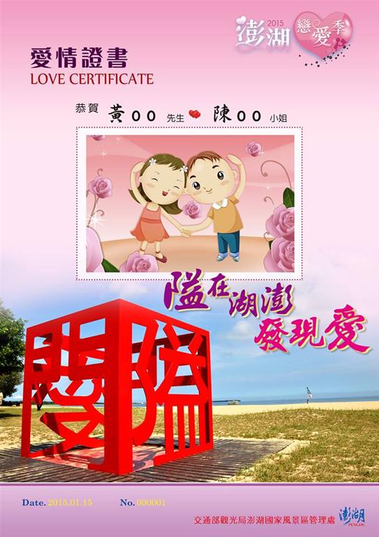 本處表示,為引爆澎湖早春之觀光旅遊熱度及吸引力,膺續配合澎湖戀愛季活動,精心規劃於活動導入浪漫、樂活元素,加強行銷「隘門沙灘」景點,賦予新的意義,特搭配辦理「隘在澎湖。發現愛」愛情證書活動,共同推廣行銷澎湖淡季觀光。