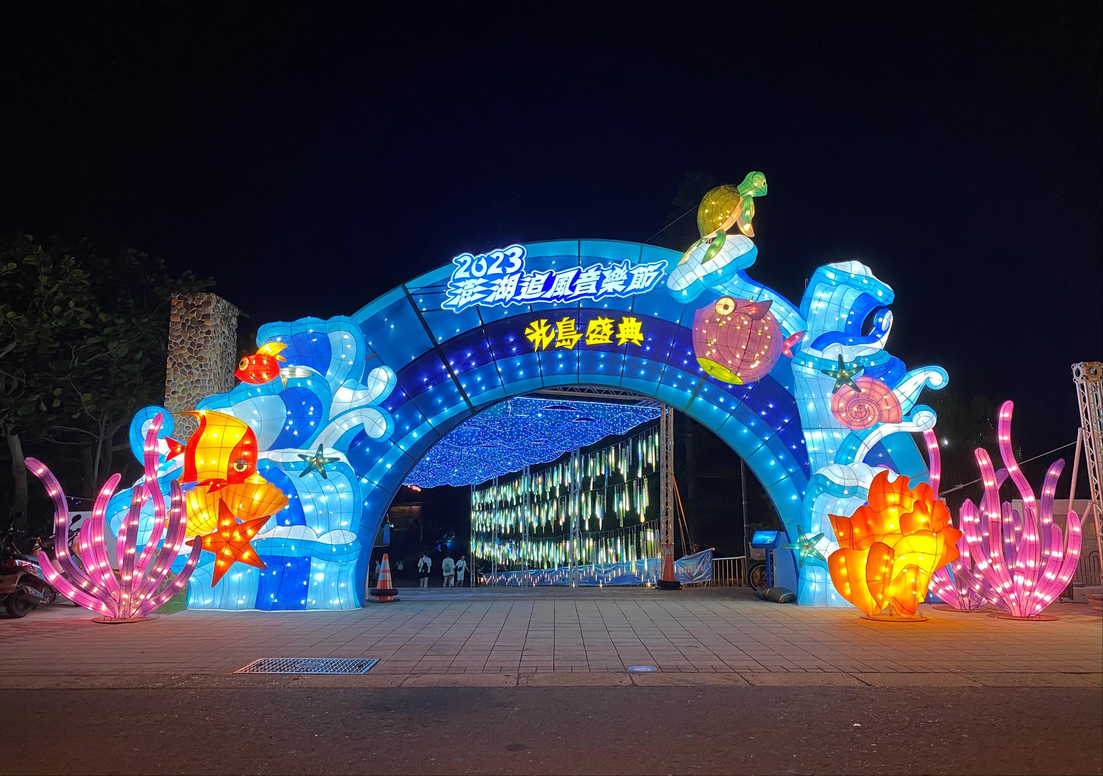 2023澎湖追風音樂節除了每週音樂展演外,還有以獨特海風為號召的光環境-光島盛典,「入口意象-光島盛典」以澎湖生態化身,結合在地「海底生態」、「島嶼地景」、「海洋文化」建構並開啟「海、島」模樣,穿越入口意象即展開精彩、熱情的旅程;接著來到「光廊-隨波逐浪」我們以水的概念,融入光廊中,讓民眾走進光廊彷彿行走於澎湖水道,帶著大家隨波逐浪,滑進最精彩的澎湖追風音樂節。