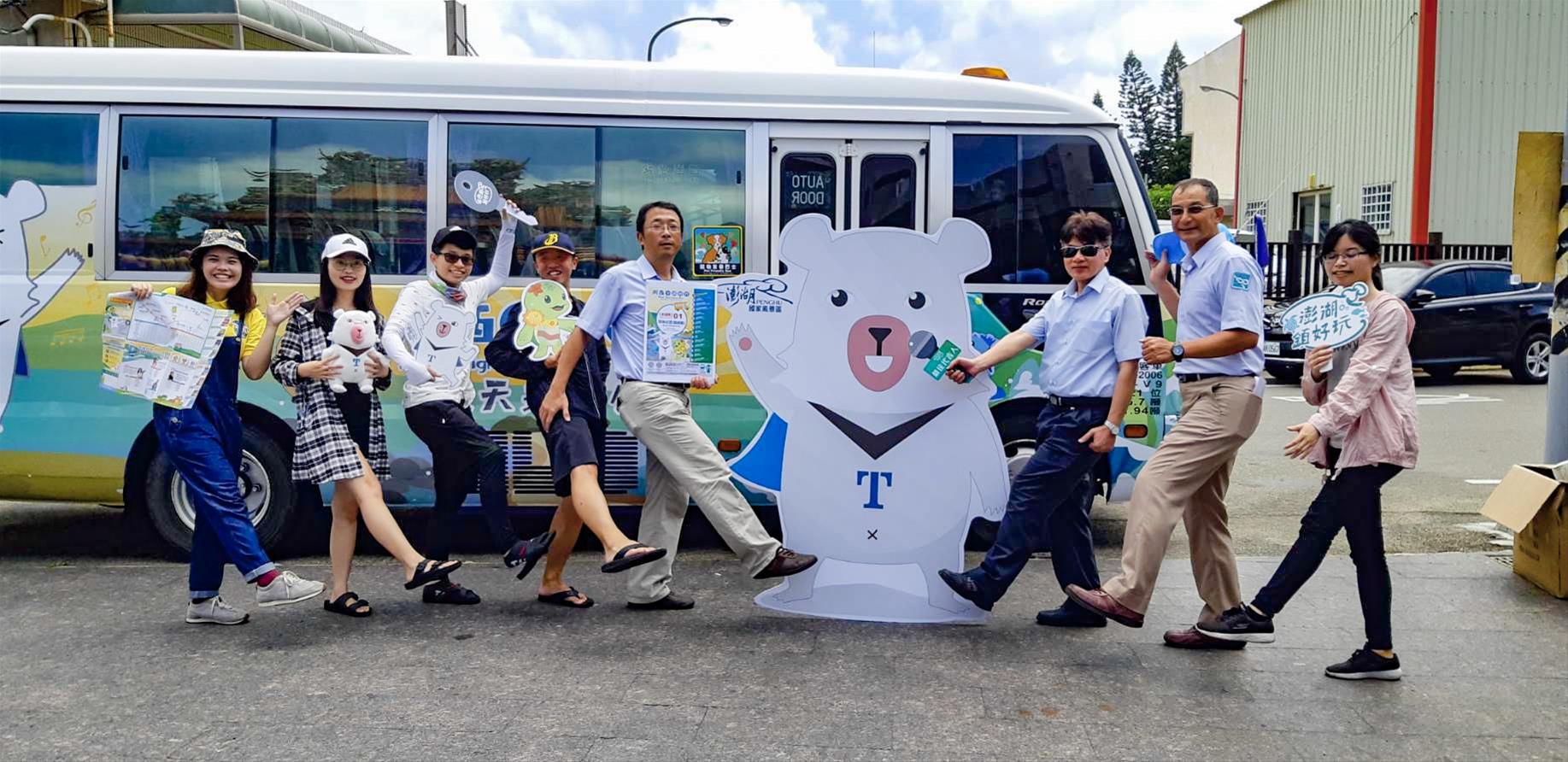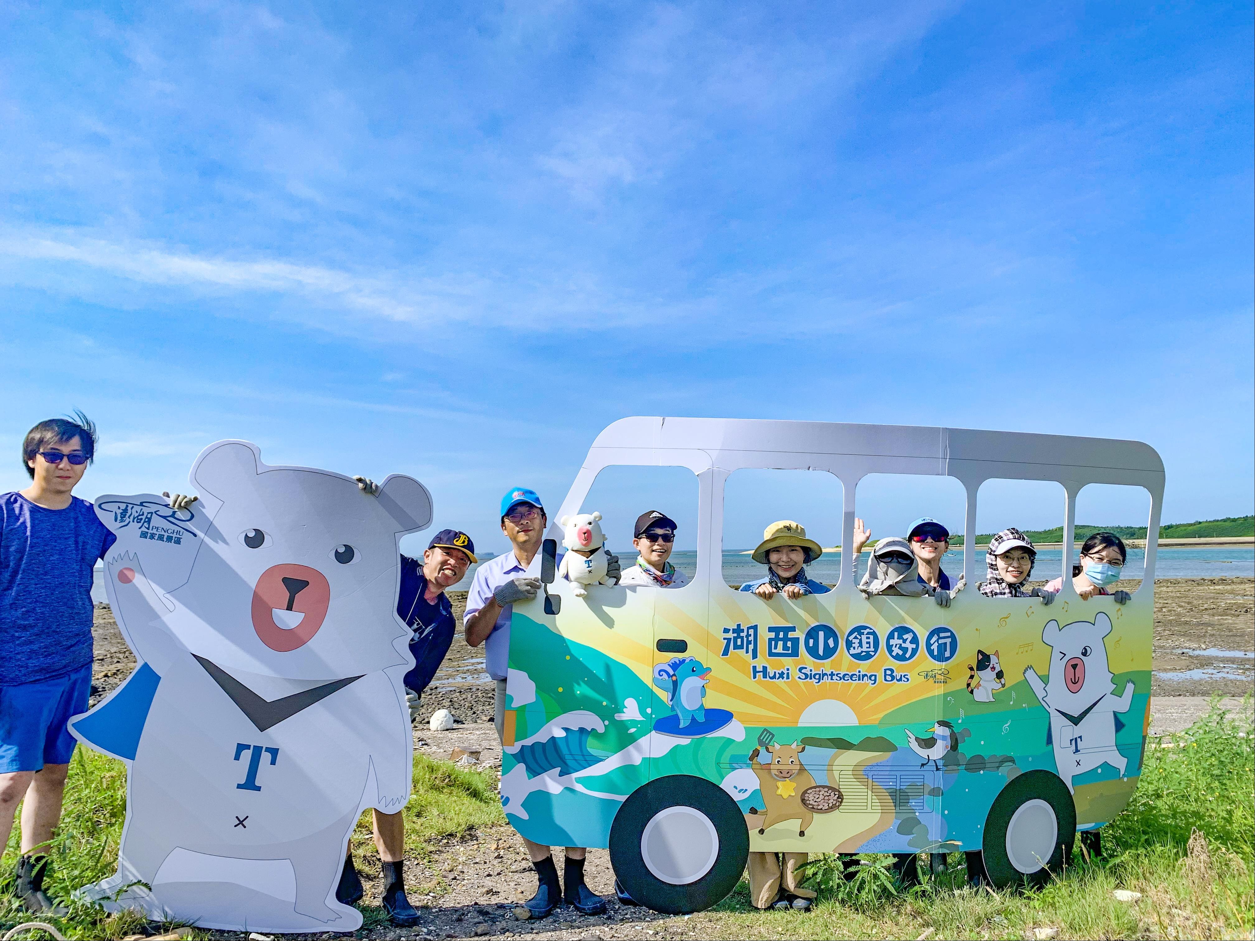 「湖西小鎮好行」彩繪巴士7月1日開跑日,由澎管處洪副處長志光偕同媒體先進朋友們,在「湖西小鎮好行」巴士導覽員嗨熊的帶領下,由首站西衛社區(宸威殿)搭乘湖西小鎮好行巴士,沿途停靠隘門沙灘、北寮奎壁山等知名景點,並前往湖西鄉紅羅村體驗【我愛澎湖,一生守滬-離島出走。石滬修復】套票行程。