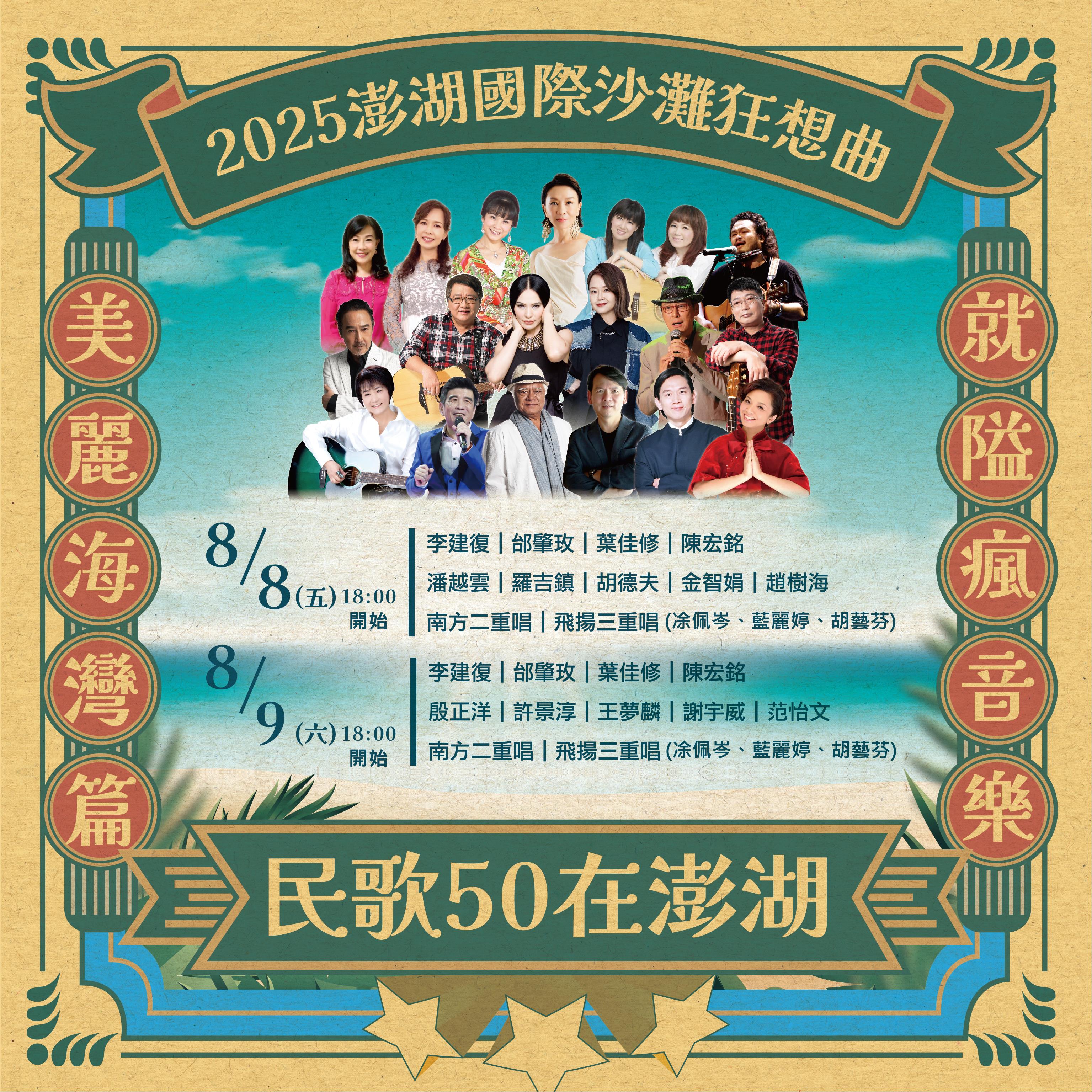 活動場地位在隘門沙灘臨海而設,讓旅客在夕陽餘暉與星空海浪的陪伴下,盡情沉浸在民歌的旋律中,為炎炎夏夜注入一股清新且懷舊的音樂芬多精。除了「民歌50在澎湖-美麗海灣篇」演唱會,活動現場更設有超過20攤之特色市集,演唱會後更有沙灘瑜珈活動,共同打造出兼具感官享受與身心放鬆的獨特饗宴。澎管處邀請大家在8月一同前來澎湖參與「2025澎湖國際沙灘狂想曲」,一起看海景、玩沙灘、聽音樂,chill出夏日新滋味