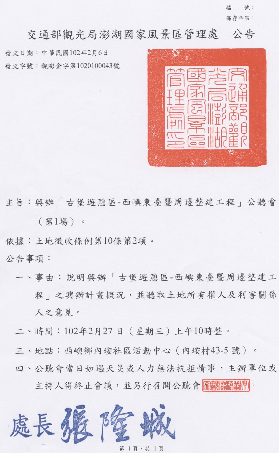 說明興辦「古堡遊憩區─西嶼東臺暨周邊整建工程」之興辦計畫概況,並聽取土地權人及利害關係人之意見,澎管處訂於102年2月27日(星期三)上午10時整,假西嶼鄉內垵社區活動中心舉辦公聽會(第一場)。詳細公告內容如附件。