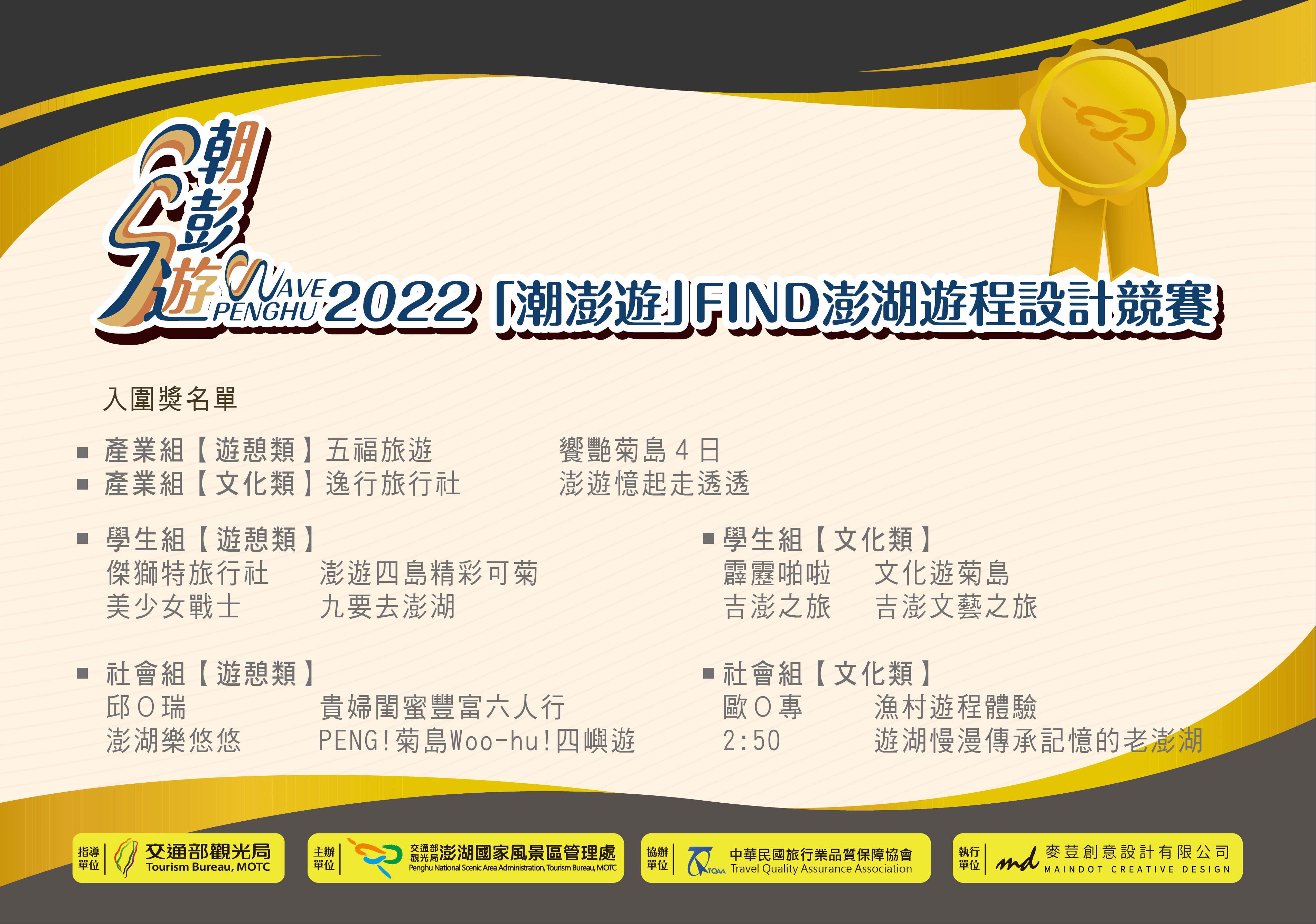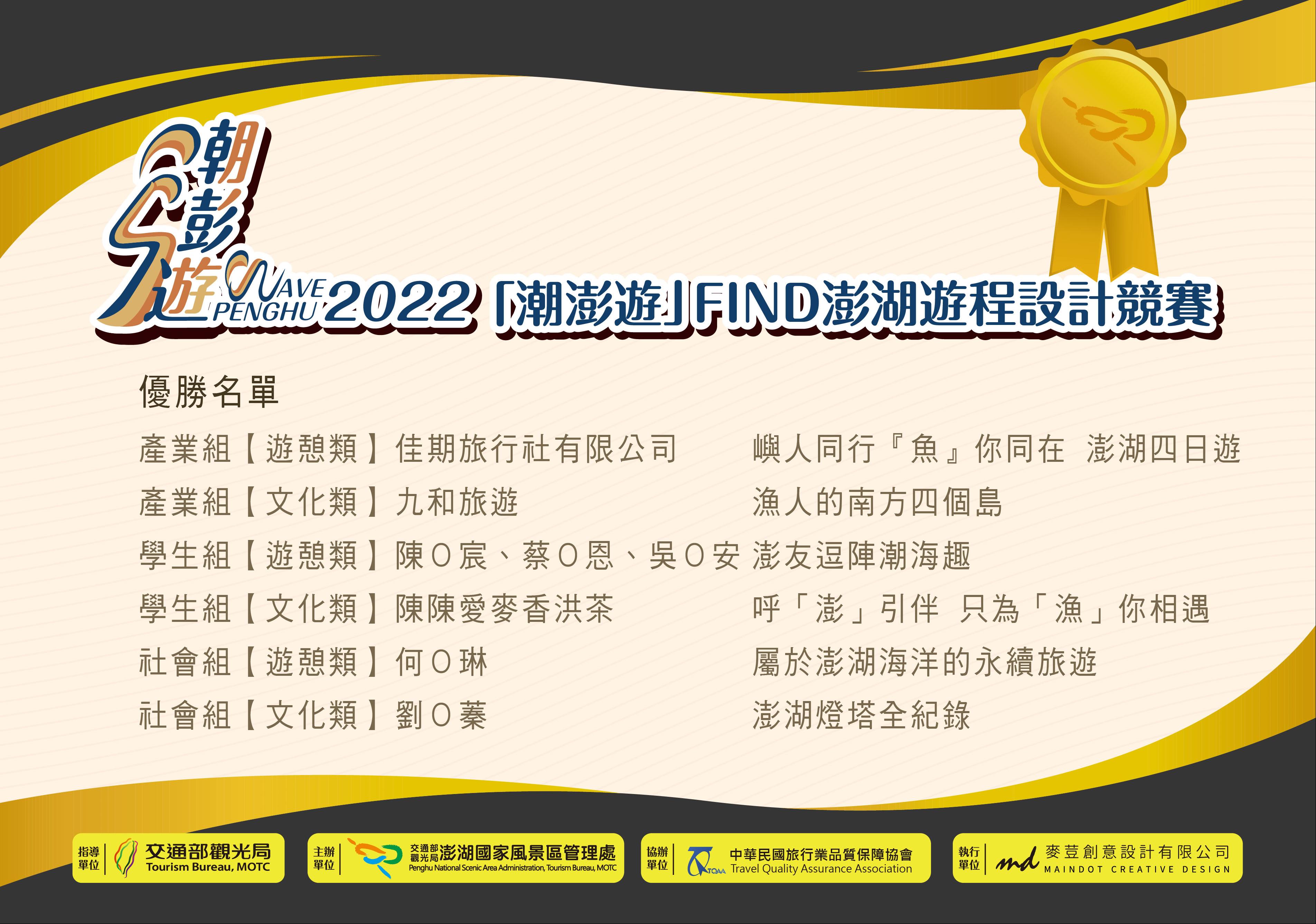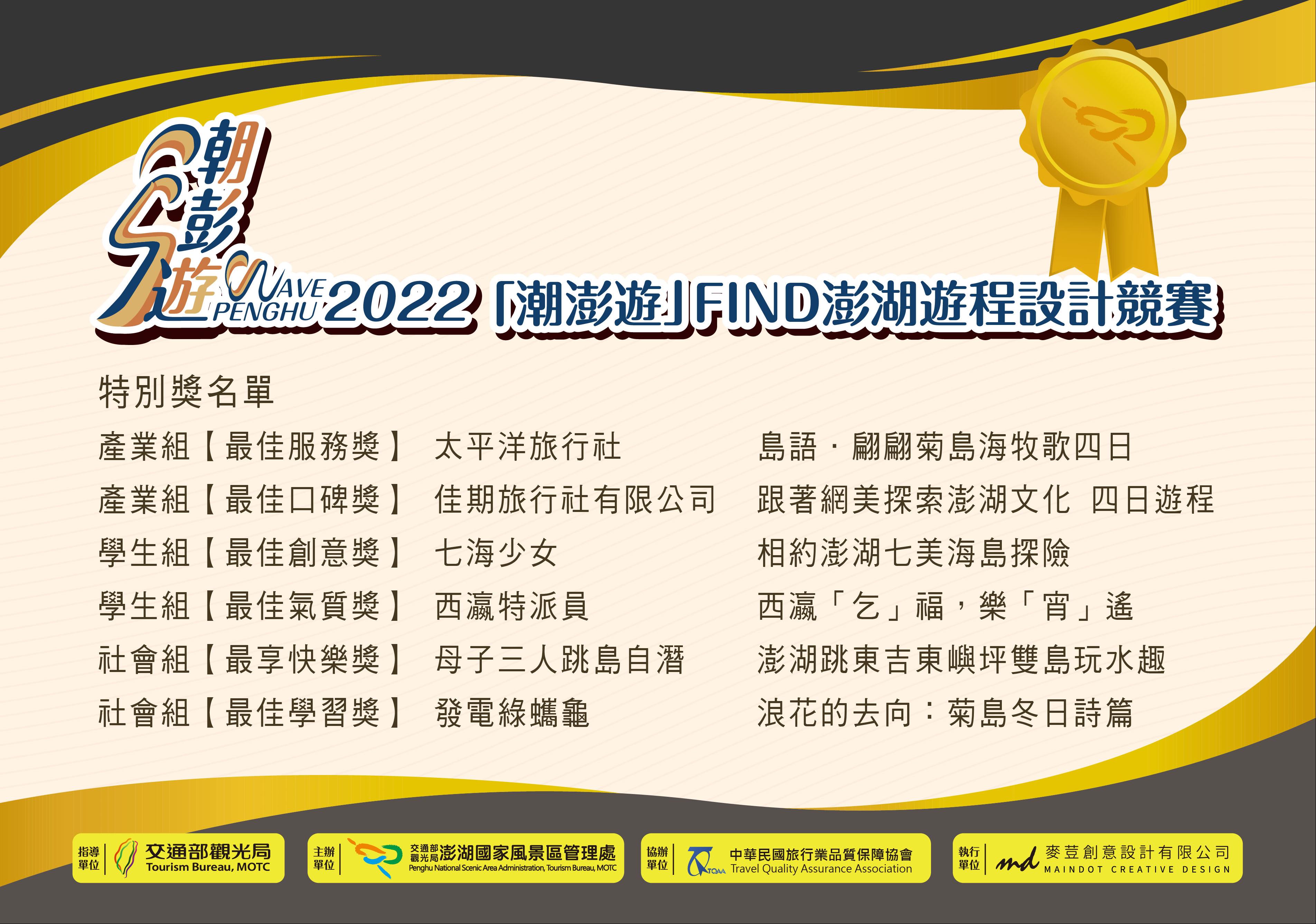 本處辦理2022「潮澎遊」FIND澎湖遊程設計競賽,得獎名單已經出爐囉!經過產業組、學生組、社會組各類別參賽者熱情參與,評審老師謹慎、用心的評分,分別選出6組優勝、6組特別獎及入圍獎10組,恭喜各組脫穎而出的參賽者。