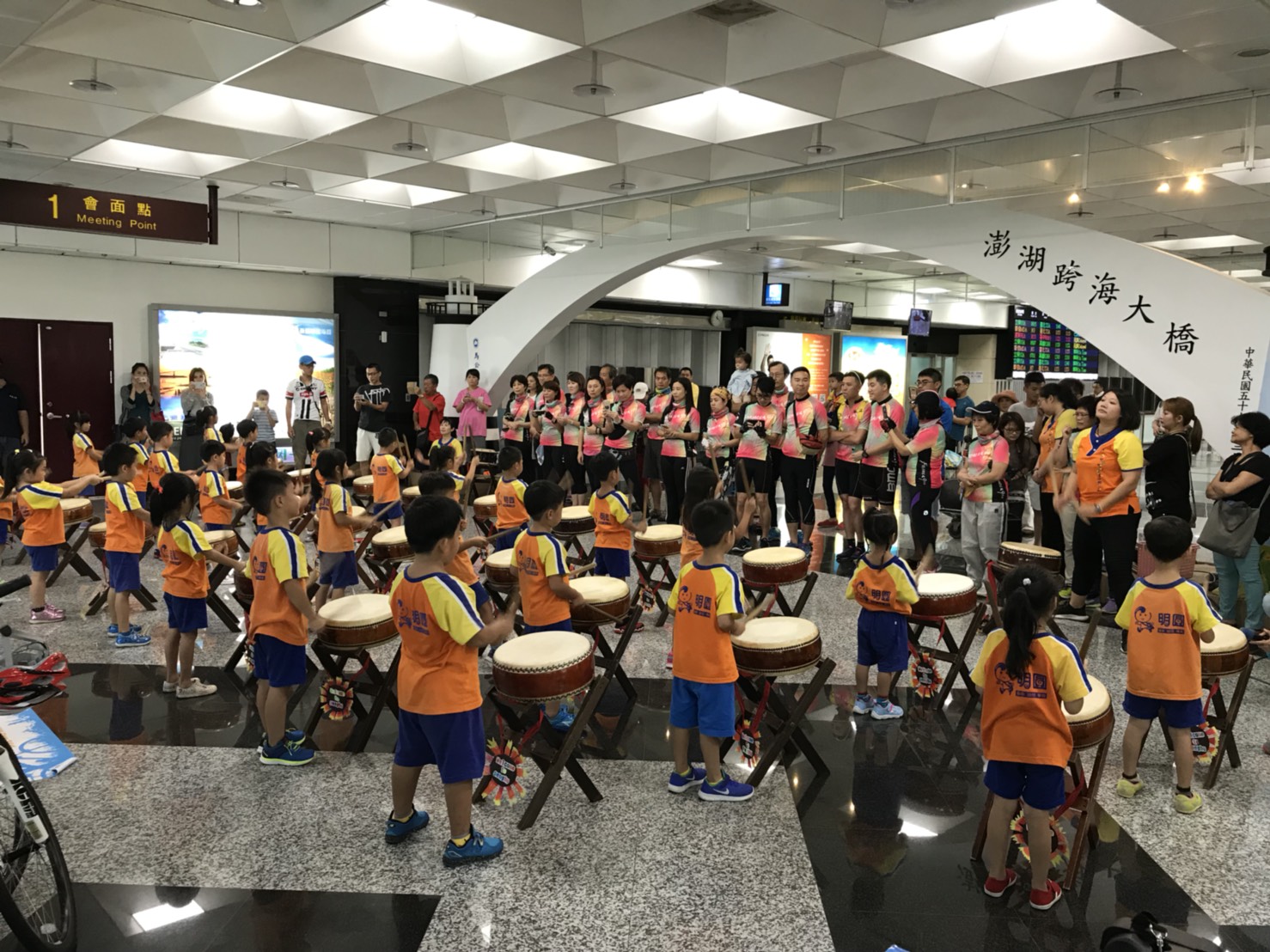 今(14)日雖然受卡努颱風外圍環流影響,但仍不減車友伙伴對嚮往已久自行車跳島之旅的憧憬,在澎管處的安排下,11時許在馬公航站到站大廳,由明圓幼兒園的陳寶圓園長率領師生以熱情的太鼓打擊樂表演歡迎大家的蒞臨,隨後又為每位車友親手戴上小朋友DIY的完騎獎牌,現場的車友對於這場別具特色的迎賓啟航儀式,無不感到驚喜連連。