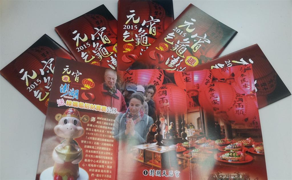 本處為讓遊客感受澎湖元宵節活動傳統熱鬧氛圍,於澎湖各遊客中心提供「2015元宵乞龜趣澎湖」摺頁,內容精彩介紹代表廟宇乞龜、猜燈謎等民俗慶典活動,並於即日起至3月9日止元宵節前後期間,於澎湖機場出境大廳旅遊服務中心及澎湖遊客中心辦理「元宵遊澎湖送綠蠵龜招財寶寶公仔」活動。