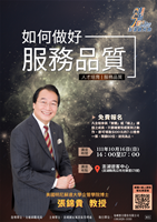 「服務品質-如何做好服務品質」張錦貴講師,總演講數累積一萬場次,現場聽衆累積五百萬人以上,張教授受聘為三百多家公司的顧問,累積二十幾年的企管專長,此次課程從服務品質提升出發,從服務的理念及基本態度至影響服務績效的關鍵因素﹔何謂「顧客所重視的服務品質之道」,實務結合理論雙管齊下,屆時讓大家真正了解問題並解決問題,是聽了還想再聽的經驗分享。