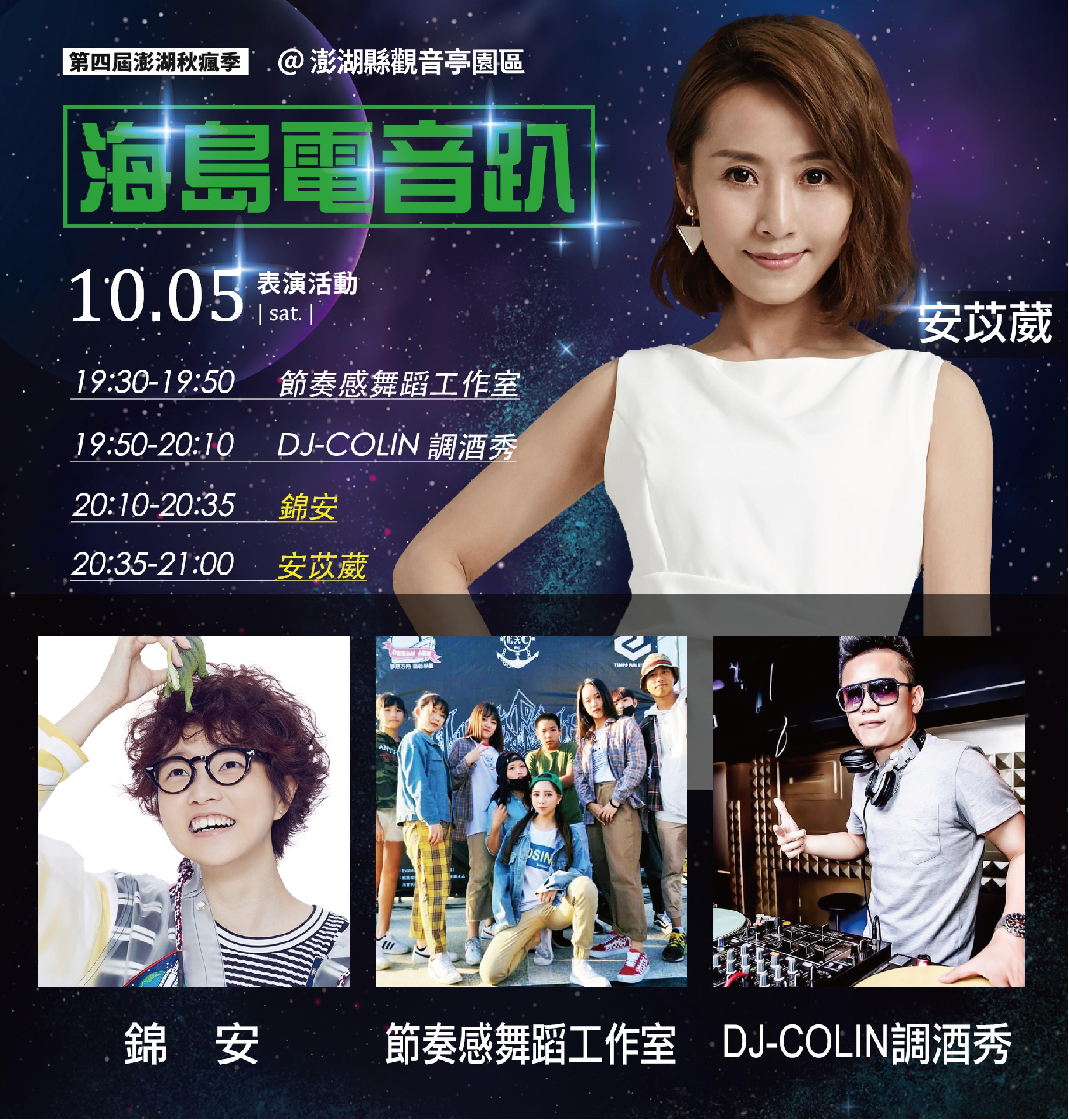 澎湖第四屆秋瘋季重點活動,澎湖國際燈光節週週精彩,本週迎來備受大眾喜愛的電音表演集合,準備要嗨翻菊島夜晚!不只有全台眾所皆知的前芭比團員安苡葳帶來勁歌演出,澎湖本地強檔舞團節奏感舞蹈工作室為電音之夜掀起序幕,更有曾在台北知名W飯店演出過的DJ-COLIN帶來調酒秀,「最強旋律製造機」錦安讓你沉醉在深刻的律動中,10月5日這周六千萬別錯過海島電音趴!