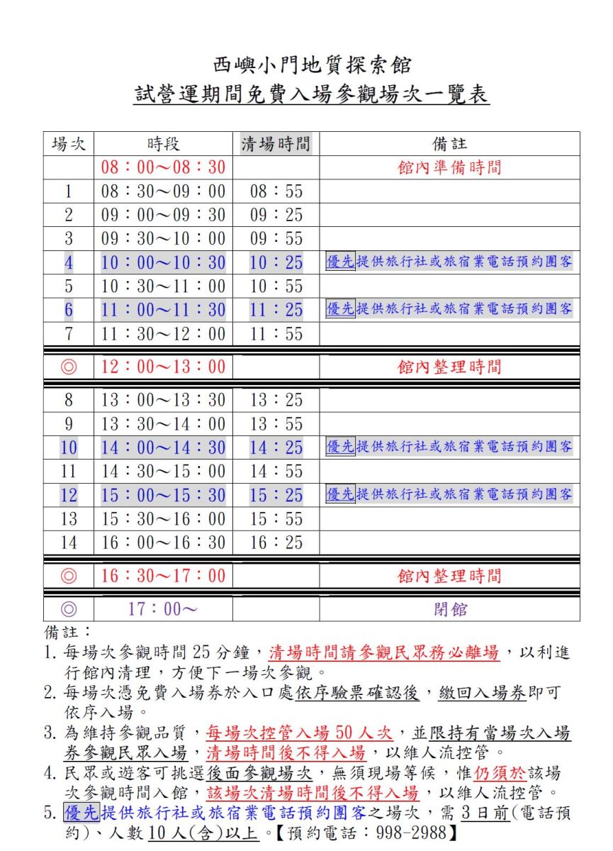 小門地質探索館從即日起試營運至4月15日,為讓遊客有更舒適參觀品質,將進行人流管制,一天14梯次,每梯次開放50位民眾進場,自上午08:30至12:00及下午13:00至16:30,每隔半小時供開放參觀,共14梯次,團體預約民眾可提前致電向小門地質探索館預約。