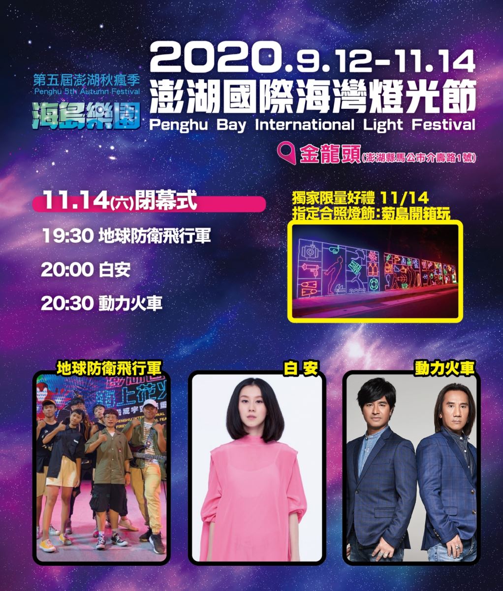 由交通部觀光署澎湖國家風景區管理處所主辦的「2020澎湖國際海灣燈光節」今年在澎湖金龍頭盛大舉行,活動將在11月14日晚間正式畫下句點,閉幕當日將由唱腔獨特的創作精靈白安與近期發佈多首新歌的搖滾天團動力火車接力演出,將帶領民眾HIGH到最高點,期待所有鄉親及遊客們把握今年最後一次機會,共同來見證「2020澎湖國際海灣燈光節」最燦爛、最感動的菊島之夜!