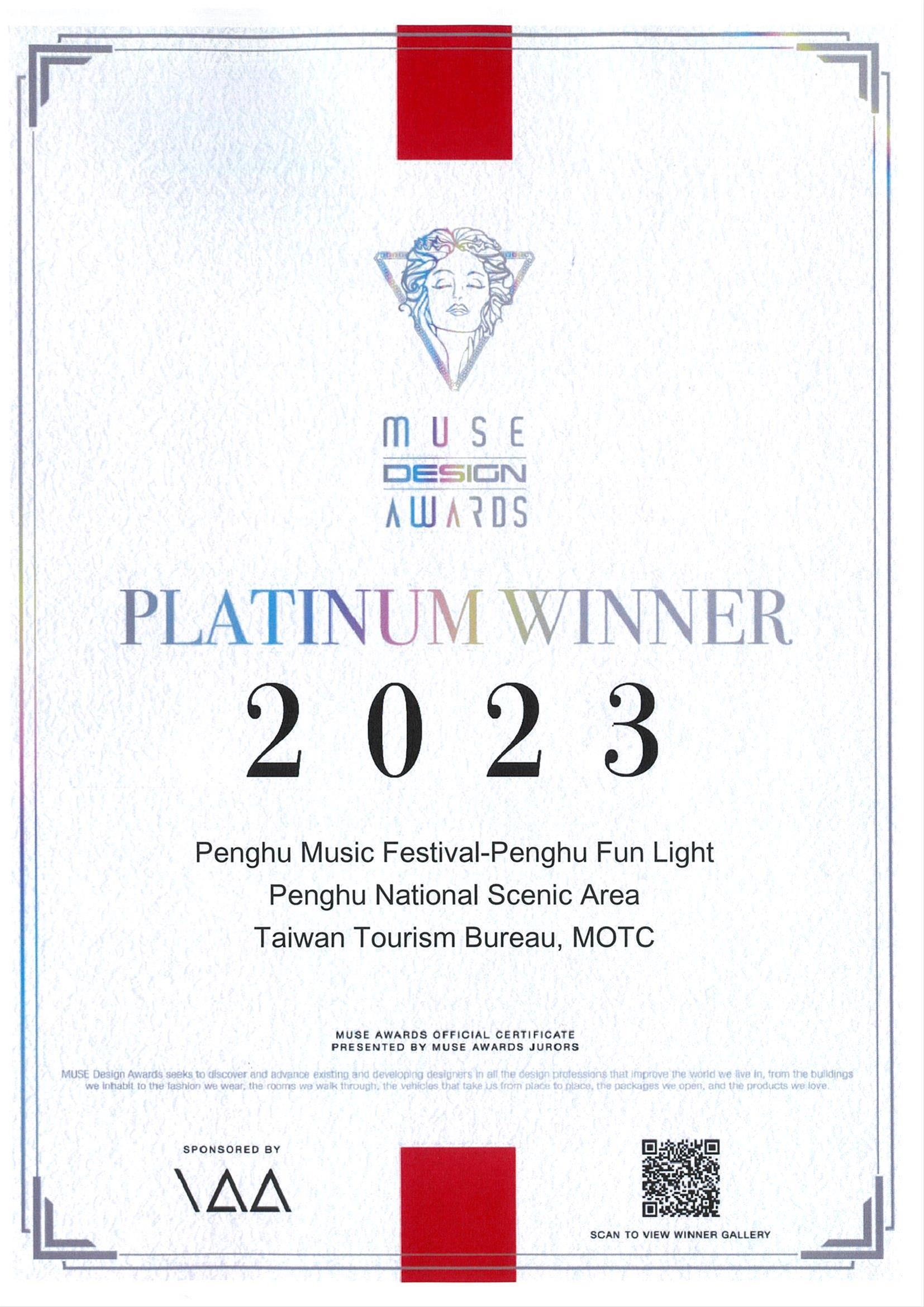 The promotional videos for the Penghu tourism union produced in 2022 by the Penghu National Scenic Area Administration (Penghu NSA) of the Tourism Bureau, Ministry of Transportation and Communications, has been recognized with three awards (two gold, one silver) in the categories “Video/Travel” and “Video/Lifestyle” at the MUSE Creative Awards hosted by the International Awards Association (IAA) in the United States. There are even more good news for the Overall Light Environment Design at the “2022 Penghu Music Festival!”. The festival had previously won a gold award in the Landscape Design (New) - Landscape Renovation category of the TITAN Property Awards hosted by the IAA last year. This year, winning the top “Platinum Award” in the Conceptual Design - Exhibition & Events category at the MUSE Design Awards puts Penghu back in the international limelight.
