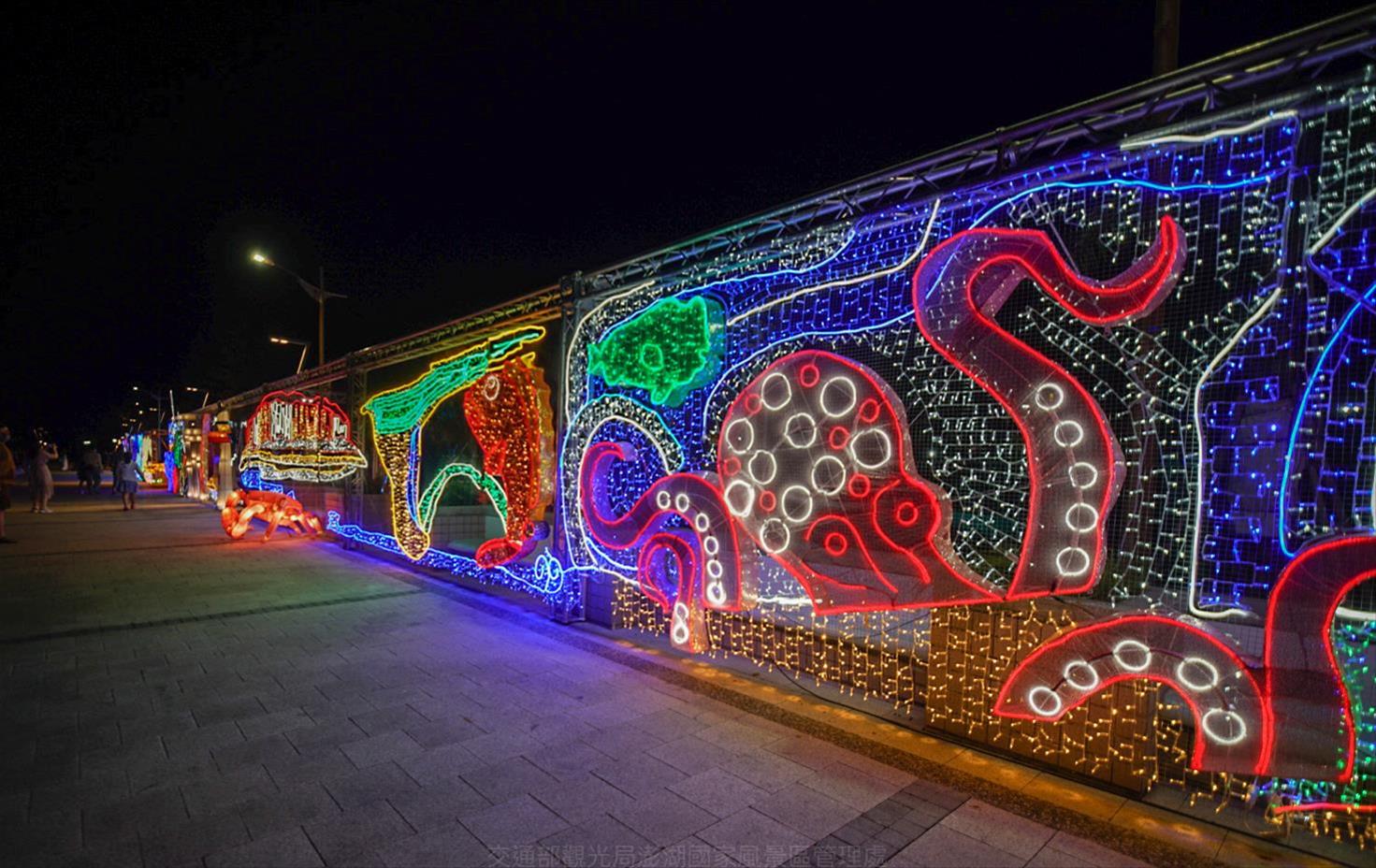 The design team (CoSquare Studio) made the night sky of Penghu their canvas. As the waves lap against the rocks, circular changes of neon light strips, and the interplay of light and shadow echo the stars of the Milky Way to light up the night. The Penghu Music Festival combines music, wind, and light to present a musical feast of light and fantasy. Under the colorful neon lights, objects of different shapes become interwoven with the local cultural and artistic resources of Penghu. The design team filled each light painting with meaning. For example, the octopus reminds people of Penghu’s traditional “Octopus Light Trapping” activity, while the “Fish Dance” shows a school of fish swimming through the sea with the lights simmering on the waves like sunlight. The fish are grouped together in a show of unity against invaders. The design team cleverly combined local stories with light paintings to give visitors a better understanding of Penghu, and let them see the connections between the people, local culture, and nature through art.