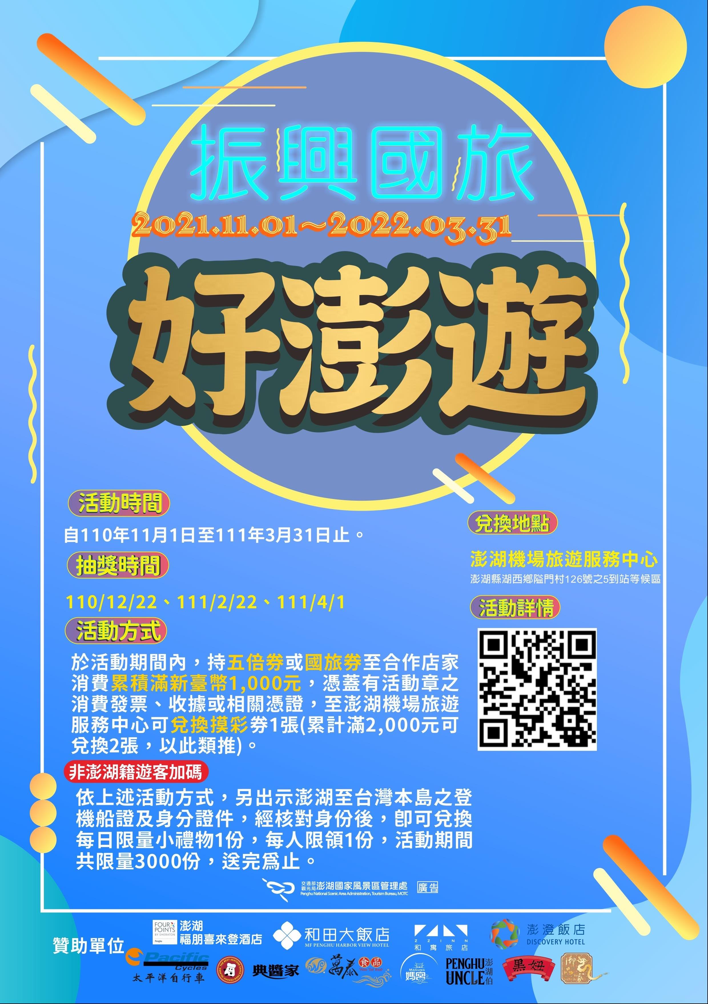 The Penghu National Scenic Area Administration of the Tourism Bureau, Ministry of Transportation and Communications, inspired to vitalize tourism in Penghu in the Autumn and Winter seasons and support the cause of the Quintuple Stimulus Voucher and Domestic Travel Voucher through integrating more than 100 local enterprises in the food and beverages, lodging service, traveling, shopping, and transportation sectors when the pandemic became less serious. To this end, the “Penghu Tour for Vitalizing Tourism of Taiwan” campaign was launched to offer tourists from November 1, 2021 to March 31, 2022. Tourists who spend NT$1,000 with a Quintuple Stimulus Voucher or Domestic Travel Voucher in participating shops can redeem 1 lucky draw ticket at the Tourist Center at Penghu Airport by presenting related invoices, receipts, or documents affixed with the campaign stamp (spending of NT$2,000 in accumulation can redeem 2 luck draw tickets, and so on). Tourists who are not natives of Penghu are entitled to an extra bonus by presenting the boarding pass for the flight to Penghu and ID card in accordance with the above procedure. A free gift will be offered upon the confirmation of identity. Each tourist can get 1 free gift and only 100 gifts will be released daily. There will be 3,000 gifts released to entitled tourists in the campaign while quantity lasts.