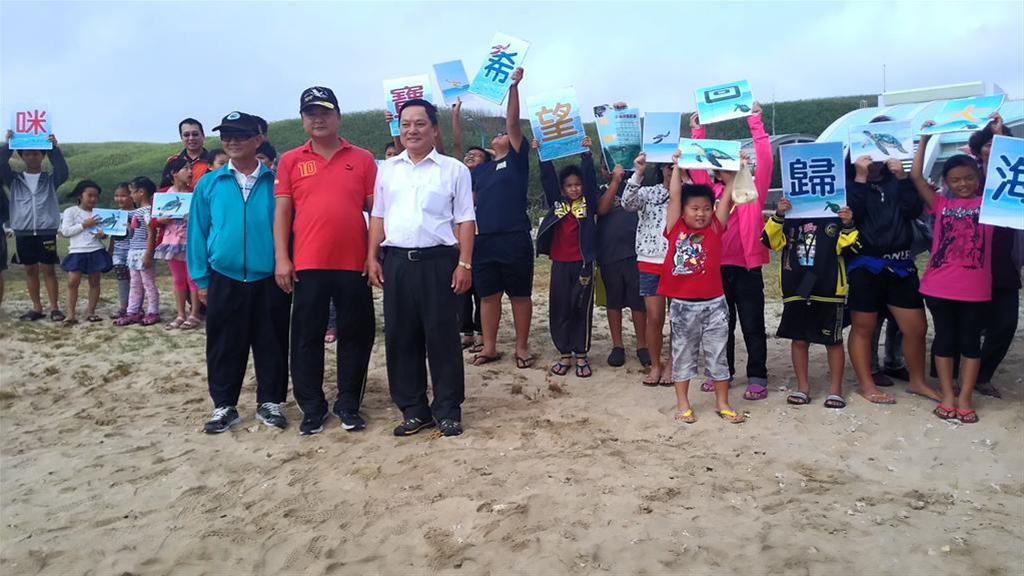 The Wangan Pacific Green Turtle Conservation Center conducted the Sea Turtle Releasing event on the beach in front of the Center at 9am on Oct 25th. This event was overseen and participated by Township Mayor Xu Xiande of Wangan Township, Sea Turtle Conservation Authorities – Agriculture and Fisheries of Penghu County Government, Conservation Center Co-director Wen Da, citizens of Wangan community, junior high school and elementary school students and guests. Approximately 100 people all cherished the opportunity to bear witness to the sea turtles being returned to the embrace of the sea. “Baby, Miu, and Hope, good luck!” and “Baby, Miu, Hope, bye-bye!” The students and participants all wished them good luck, and gave the three sea turtles a heart-warming send-off as they swam back to the sea.