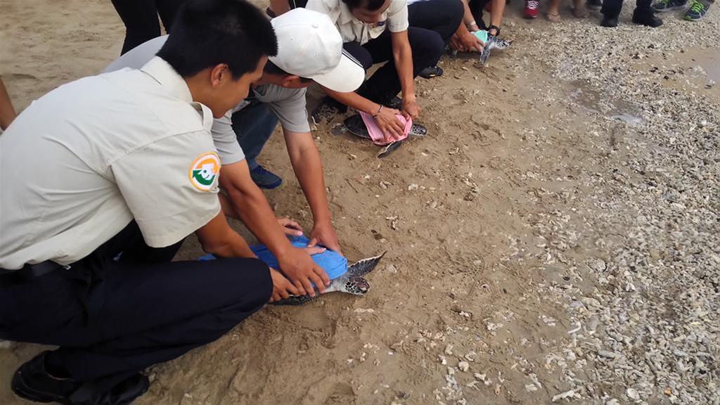 The three Pacific Green Turtles released back into the wild were juvenile turtles discovered on the beach of Wangan Earth God Port last year on July 22nd. They were found at the bottom of the nest, unable to climb out on their own, and some had been attacked by sand crabs, losing their mobility. They were recovered by Sea Turtle Patrols, and sent to be cared for by the COA of the Fisheries Research Institute. After confirming their recovery, they were moved to recovery tanks in the Wangan workstation of the Conservation Center, near the beach where they were born. The observation continued. When they were discovered, the juvenile turtles measured 5cm in shell length, and weighed only 20g. After half a year of growth, they now measured 30cm in shell length, and weighed 3kg each, and were in good health. They were sent for health examinations in the Fisheries Research Institute, COA in mid-October, and had reached the requirements for releasing.