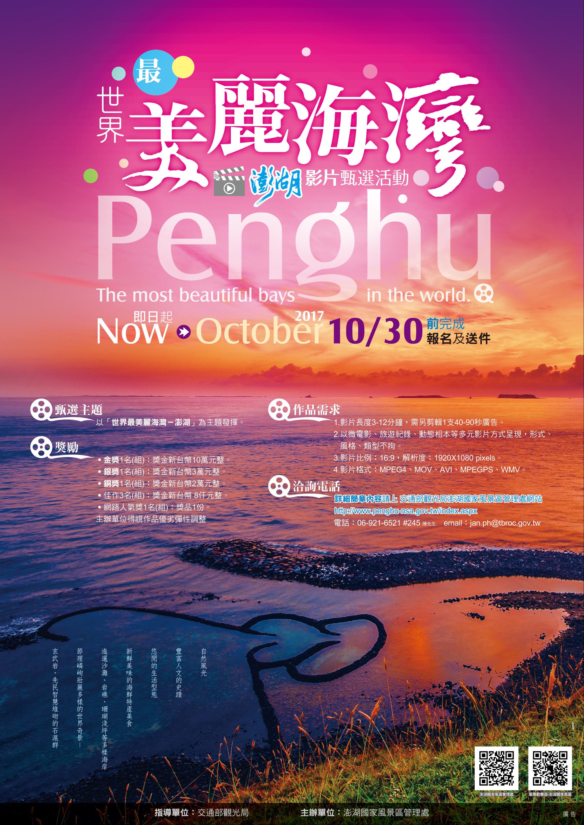 This event will start receiving videos as of February 1st till October 31st, 2017; all tourists are welcome to visit Penghu and film the magnificence of Penghu, where they would have the opportunity to contest for prizes totaling to about NT$180 thousand. For the event details and measures, please browse the official website for