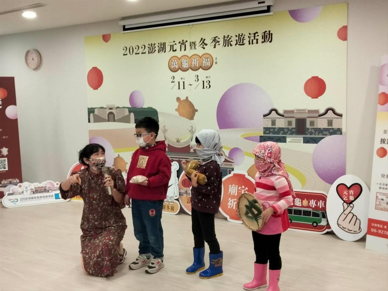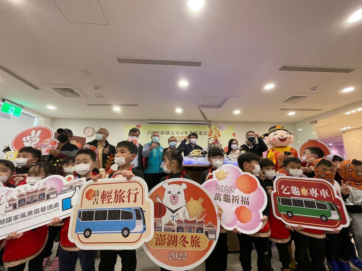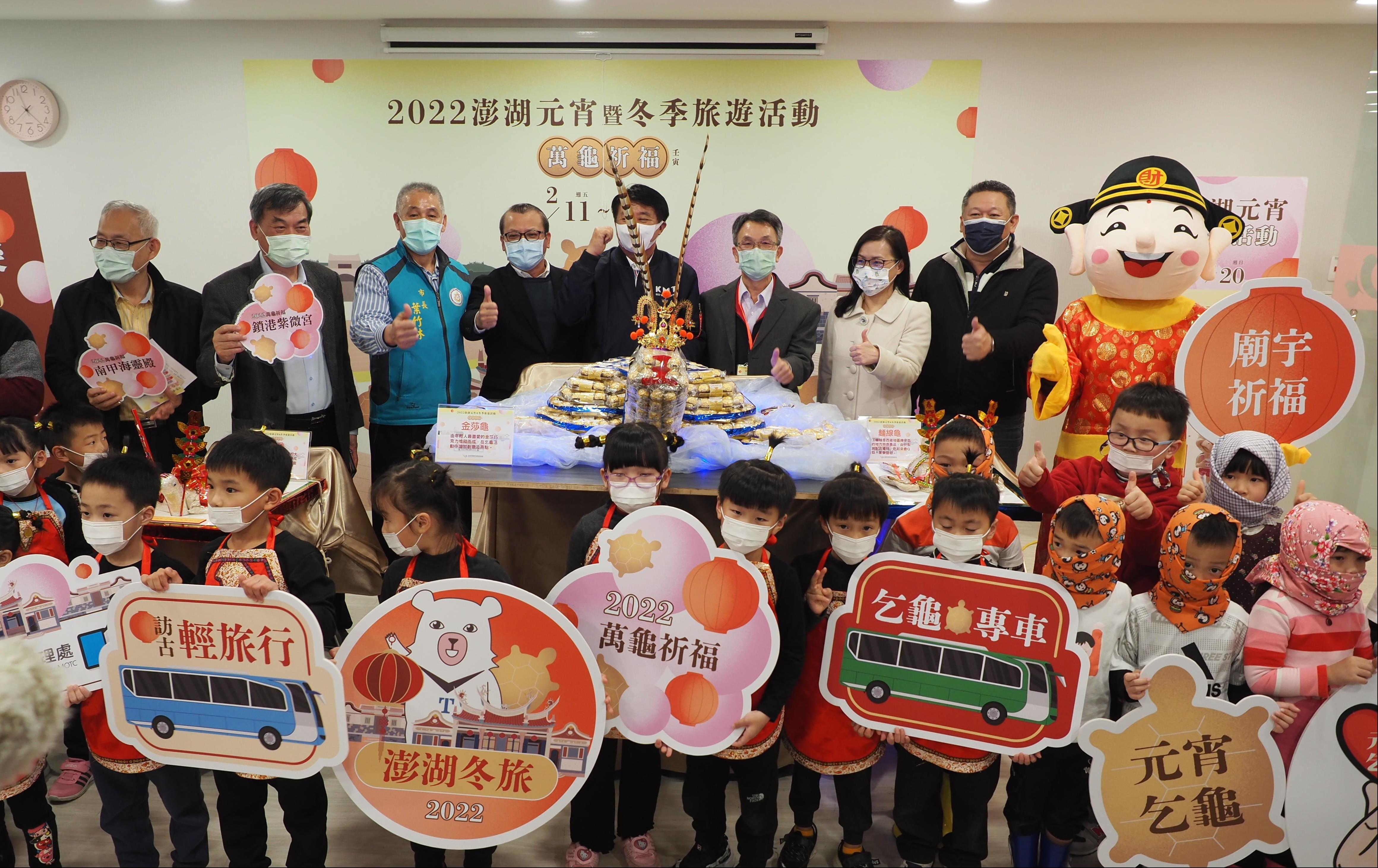 To promote this initiative, a press conference was held at 2pm on February 8 at the Penghu Tourism Promotion Center - Coni Marine Biotech Center hosted by the Director of the PNSAA, Hsu Tsung-Min. Many guests attended the press conference including Director Huang Tong-Cheng of Legislator Wu I-ding's Service Office, Vice Chairman Chen Shuang-Chuan of Penghu County Council, Director-General Hung Tung-Lin of Cultural Affairs Bureau of Penghu County, Deputy Director Liu Mei-Fan of Penghu Tourism Department, Magong City Mayor Yeh Chu-Lin, Representative Huang Hsu-Hui of City Resident Representative Council, Director Chang Chin-Hsiung of Penghu Weather Station, Chief Hung Jui-Ta of Longmen Village (Anliang Temple), Chairman Weng Chi-Chin of Penghu Ziwei Temple, Chairman Chen Ming-Hua of Nanjia Hailing Temple, as well as representatives from the tourism airline industries. The press conference was opened by children from Minyuan kindergarten. Their performance was divided into 2 sections: the first section was a festive dance and for the second, they introduced Penghu’s local characteristics such as: masked women, dried squid and fish, local snacks and Turtle-granting activities. Another highlight of this press conference was introducing Turtle-granting in the temple and light winter tourism.