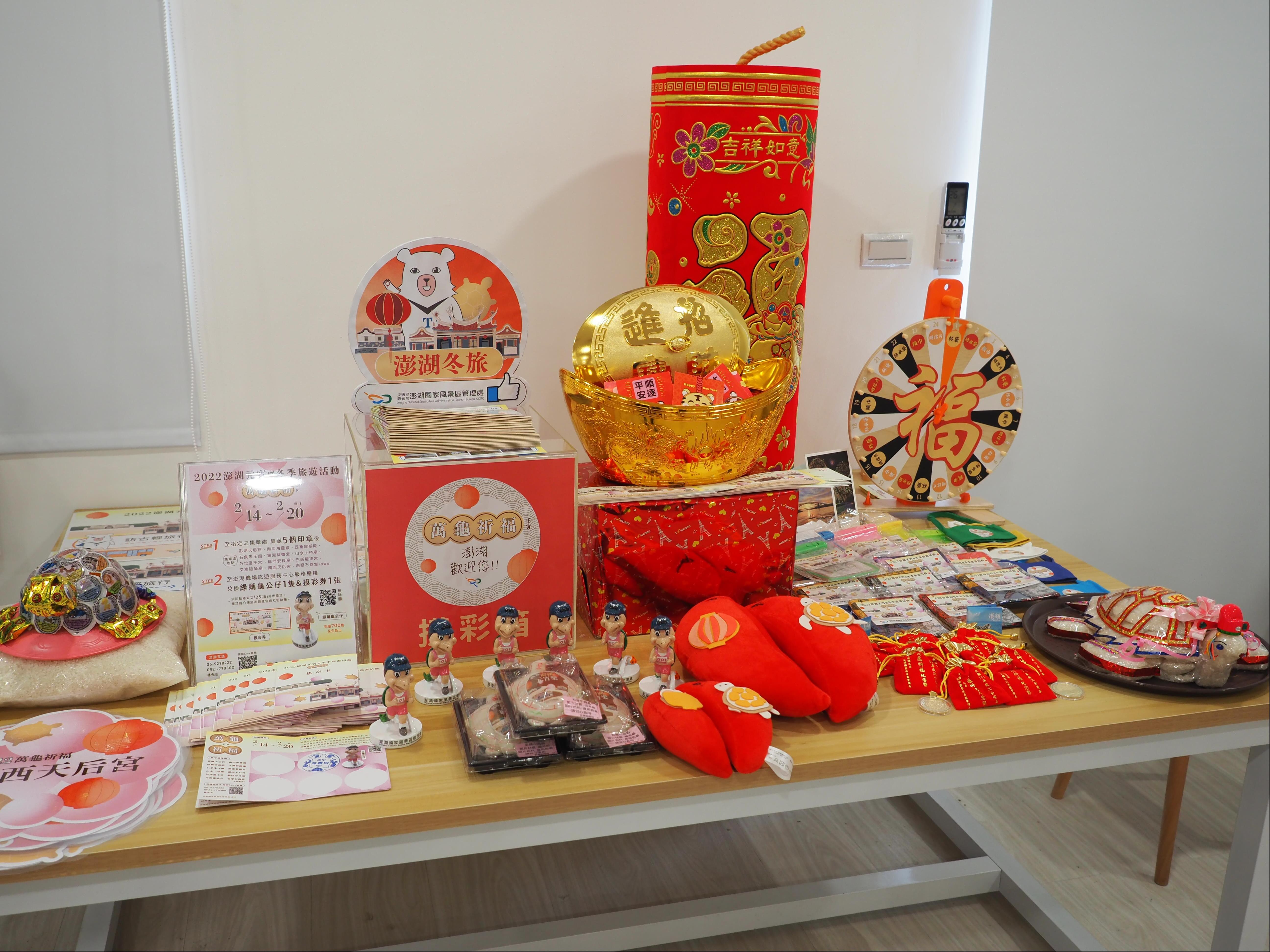 According to the Director Hsu Tsung-Min of the PNSAA, to add more fun to Lantern Festival, from February 14 to February 20, gifts will be given from the counter of the Tourist Service Center at Penghu Airport. Interactive games will be held at the counter including “Check-in gift”: those who “like” and “check in” at Gaillardia Island - Penghu National Scenic Area Fans Group will receive a postcard. To echo the spirit of the Lantern Festival, an event for riddles will also be organized where participants who answer correctly will have a chance to win a postcard, waterproof bag, water bottle bag, or bandana. Another fun game is where the visitor throws divination blocks and if the bocks land one flat and another block round 3 times, the visitor will win a Turtle-granting cake. Visitors can also get a stamp card with proof of identification: stamps can be collected at designated temples. Once 5 stamps are collected, the visitor can claim a free “green turtle plush toy” at the Tourist Service Center, Penghu Airport as well as a “raffle ticket”. Please note that green turtle plush toys are subject to availability (there are a total of 700 with 100 given away everyday). After events are completed, prizes will be drawn on February 25. Winners will be announced on the PNSAA website and fans pages.