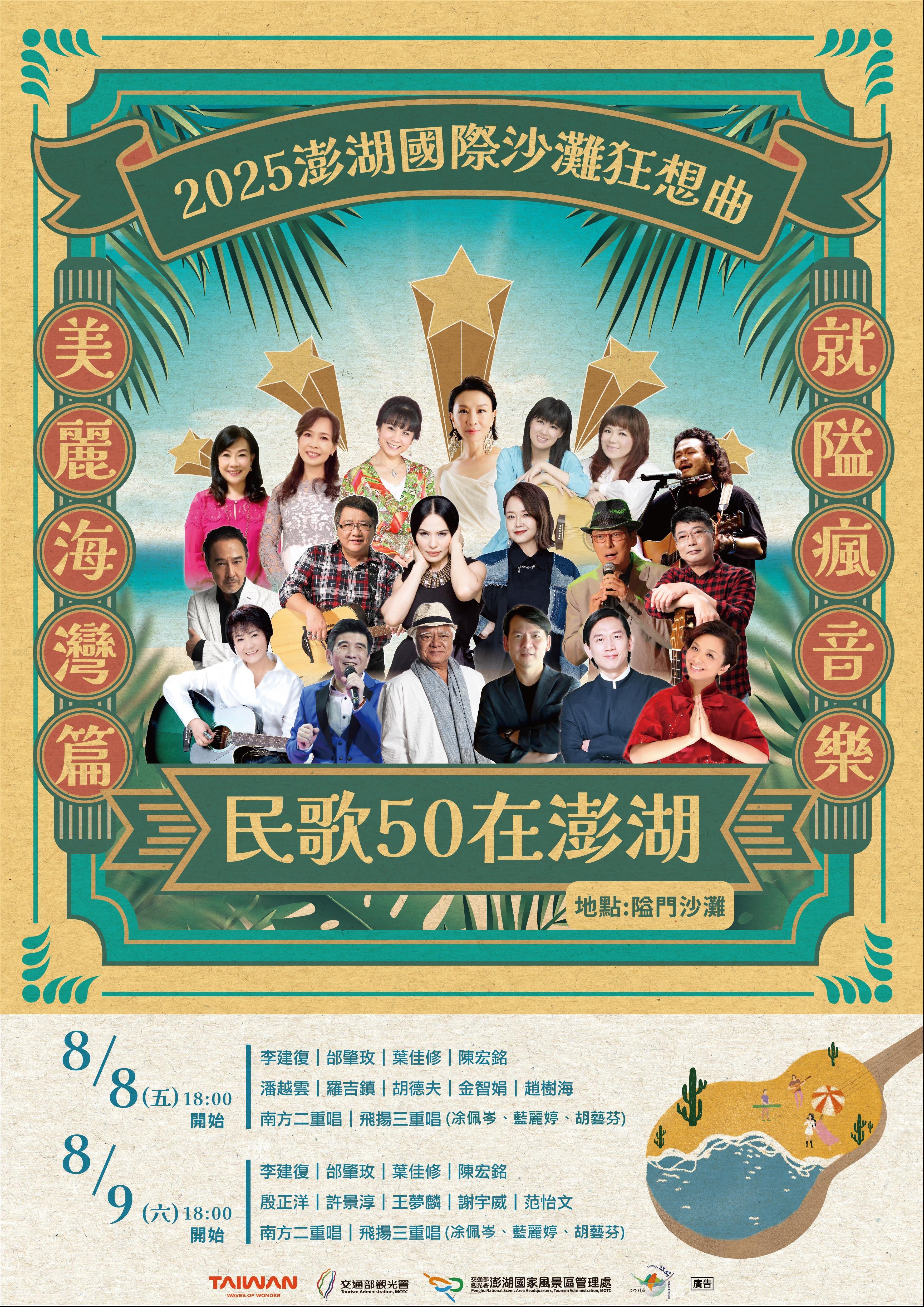 当管理部は、「2025澎湖ベイラプソディ」が澎湖の海の美しい自然景観の魅力を発信する初のイベントであると同時に、斬新で特色のあるコンサート・ビーチレクリエーションでもあることから、ユニークなスタイルの旅の魅力の創造、来訪者層の拡大、滞在期間の長期化及び再来訪率の上昇につながると考えています。その一例として、当該イベントにおいて、澎湖に淵源を持つフォークソング誕生50周年を祝し、屋外初の試みとして澎湖で初めて奉唱されます。そのほか、インディーズバンド、テクノDJ、アニメソングを数多く手がける日本のロックバンド、才能豊かなシンガーソングライターらが初の澎湖観光アンバサダーとして圧巻のパフォーマンスを披露します。真っ青な空、紺碧の海、黄金色の砂浜及び一面に咲き誇る天人菊と週替わりのテーマに沿って厳選されたコンテンツを提供するコンサート・ビーチアクティビティを一度に体験できる8月の澎湖は、観光するには絶好の機会です。