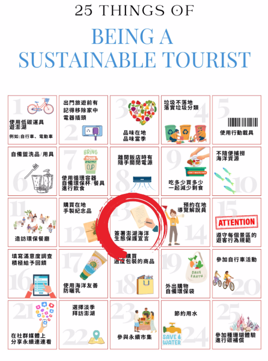 🌟 那來到澎湖旅遊,我們希望遊客可以一同進行的責任有什麼呢?一起來看看專屬澎湖的永續旅人賓果連連看吧!