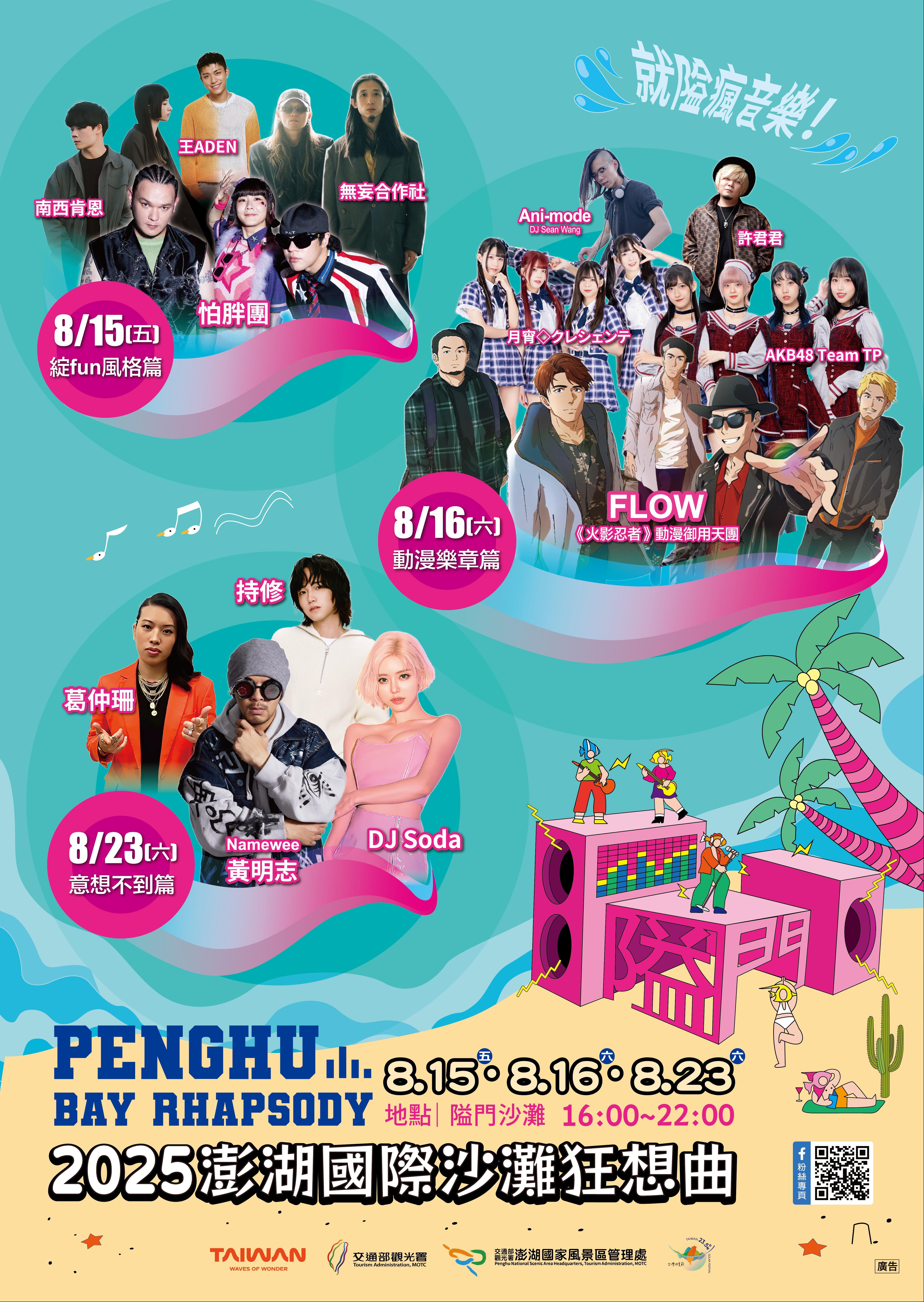 “Folk Song 50 in Penghu - Beautiful Bay Edition” was the perfect way to kick off the “2025 Penghu Bay Rhapsody” and the exciting events will continue! On Friday, August 15, the “Style and Fun Edition”, featuring popular singers and band, such as ADEN Wang and PAPUN Band, will be held. The “Anime Music Edition” will be held on Saturday, August 16, and feature the official group of the Naruto theme song, FLOW, as well as various other popular idol groups and singers. Finally, the “Unexpected Edition”, will be held on Saturday, August 23, and include many popular domestic and foreign artists, including DJ Soda and Namewee Wee Meng Chee. Don’t miss this exciting lineup! For more information on the event, please follow the Facebook page of the Penghu Administration.