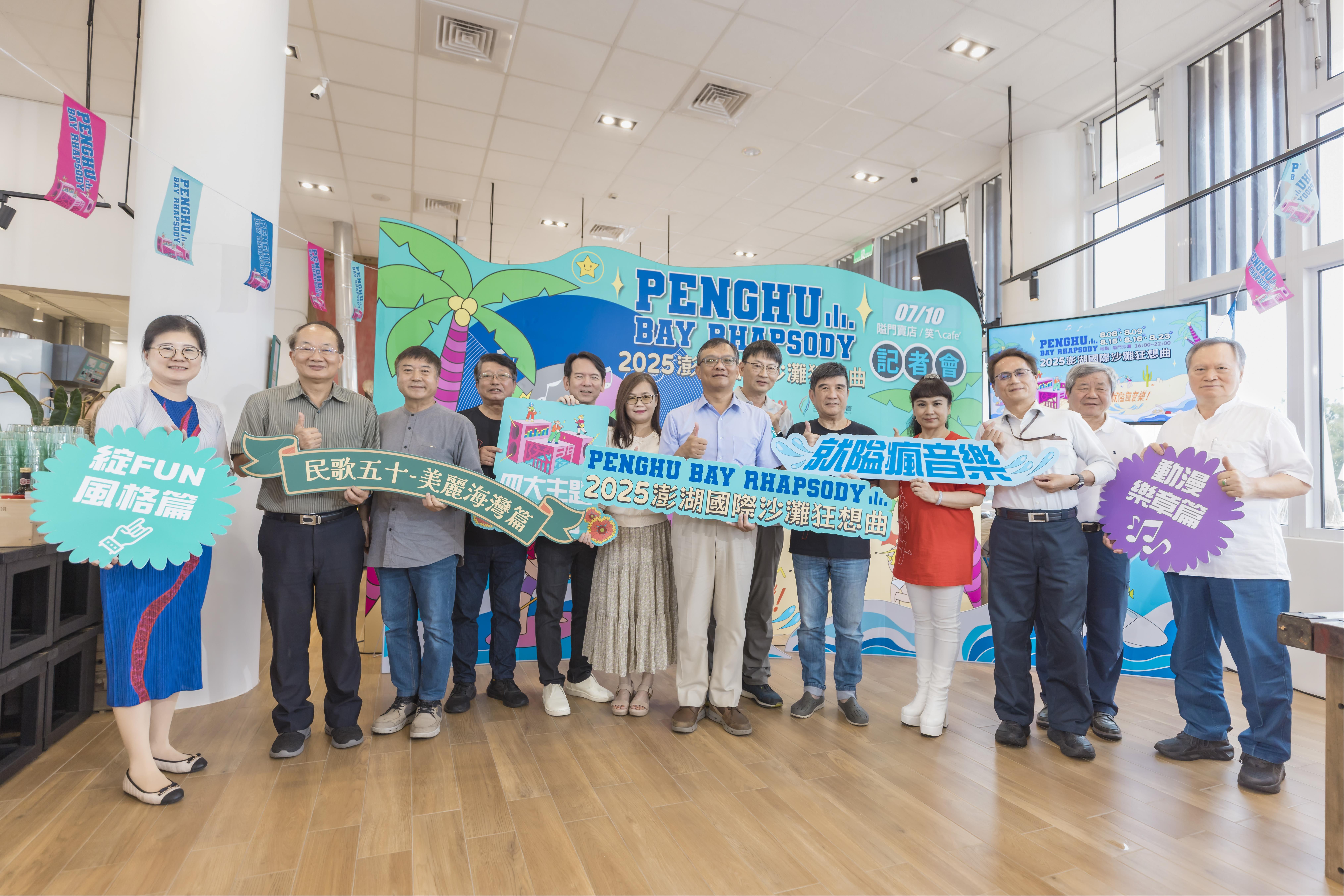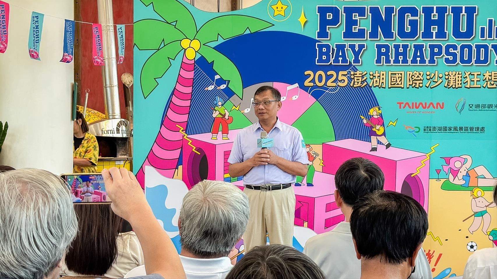 To maintain the brand as one of the world’s most beautiful bays and enhance the international visibility of Penghu tourism, the Penghu National Scenic Area Headquarters, Tourism Administration, MOTC (herein after referred to as the Penghu Administration), meticulously planned the “2025 Penghu Bay Rhapsody” event and held a promotional press conference today (the 10th) at the popular seaside café, “Smile Café”, located at Aimen Beach, Penghu. Not only was it hosted and enthusiastically promoted by the Director of the Penghu Administration, Chen-Ling Kuo, it also attracted many guests and media representatives including the Mayor of the Huxi Township, Penghu County, Jhen-Jhong Chen, the Deputy Director of the Marine National Park Headquarters, National Park Service, Ministry of the Interior, Shang-Ching Lin, the Deputy Director of the Tourism Department, Penghu County Government, Mei-Fan Liu, the Director of the Penghu Airport, Civil Aeronautical Administration, Ministry of Transportation and Communication, Yu-Shen Chiu, and the Chairman of the Aimen Community Development Association in Huxi Township, Penghu, Wen-Yi Hong, etc., to kickoff the most unique and innovative theme of the year - “Jamming in Aimen”.