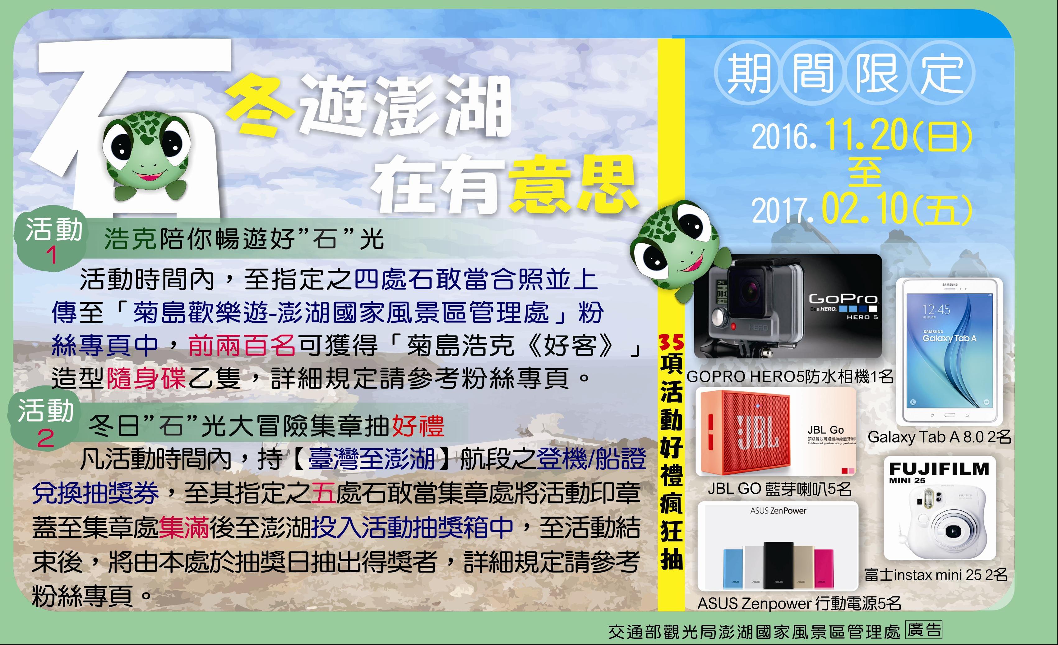 マーケティング効果を達成し、イベントをより楽しいものにするため、今回の「澎湖の冬旅‧ユニークな『石』の世界」イベントでは、特別に澎管処のマスコットキャラクターである「菊島浩克」による「浩克と一緒に過ごす『石』の旅」及び「冬の『石』の大冒険スタンプラリープレゼント」イベントを開催します。2016年11月20日から2017年2月10日までの期間中に澎湖を訪れ、澎湖の航空券または乗船券及び身分証明書を澎湖空港ビジターセンターまたは澎管処澎湖ビジターセンターにてご提示いただくと、イベント専用パンフレットと石敢當のスタンプカードを受け取ることができます。また、イベント期間中に5ヶ所の石敢當(石塔)のスタンプを集めて抽選券を抽選ボックスに入れ、抽選に参加することができます。抽選でスポーツカメラ、タブレットPCなど(合計35名様)様々な豪華プレゼントがもらえます。1名様につき当選回数は1回です。その他、4ヵ所以上の石敢當と一緒に撮影した写真を澎管処の「菊島歓楽遊」Facebookページにアップロードして、澎湖ビジターセンター受付にて写真の投稿記録をご提示いただくと、条件を満たした先着200名様に「菊島浩克『好客』」USBを1つプレゼント致します。